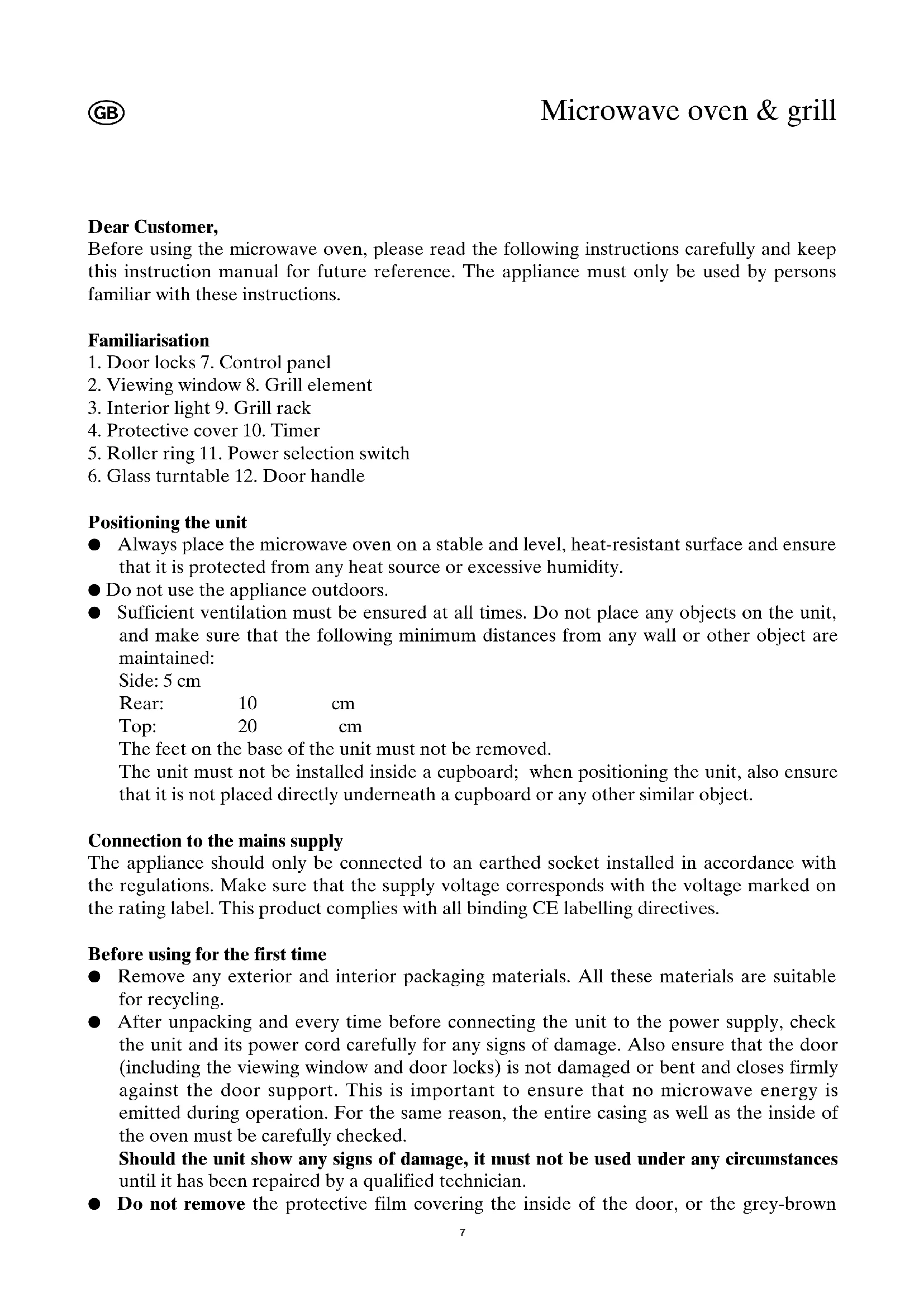 Positioning the unit ● Always place the microwave oven on a stable and level, heat-resistant surface and ensure that it is protected from any heat source or excessive humidity. ● Do not use the appliance outdoors. ● Sufficient ventilation must be ensured at all times. Do not place any objects on the unit, and make sure that the following minimum distances from any wall or other object are maintained: Side: 5 cm Rear: 10 cm Top: 20 cm The feet on the base of the unit must not be removed. The unit must not be installed inside a cupboard; when positioning the unit, also ensure that it is not placed directly underneath a cupboard or any other similar object. Connection to the mains supply The appliance should only be connected to an earthed socket installed in accordance with the regulations. Make sure that the supply voltage corresponds with the voltage marked on the rating label. This product complies with all binding CE labelling directives. Before using for the first time ● Remove any exterior and interior packaging materials. All these materials are suitable for recycling. ● After unpacking and every time before connecting the unit to the power supply, check the unit and its power cord carefully for any signs of damage. Also ensure that the door (including the viewing window and door locks) is not damaged or bent and closes firmly against the door support. This is important to ensure that no microwave energy is emitted during operation. For the same reason, the entire casing as well as the inside of the oven must be carefully checked. Should the unit show any signs of damage, it must not be used under any circumstances until it has been repaired by a qualified technician. ● Do not remove the protective film covering the inside of the door, or the grey-brown