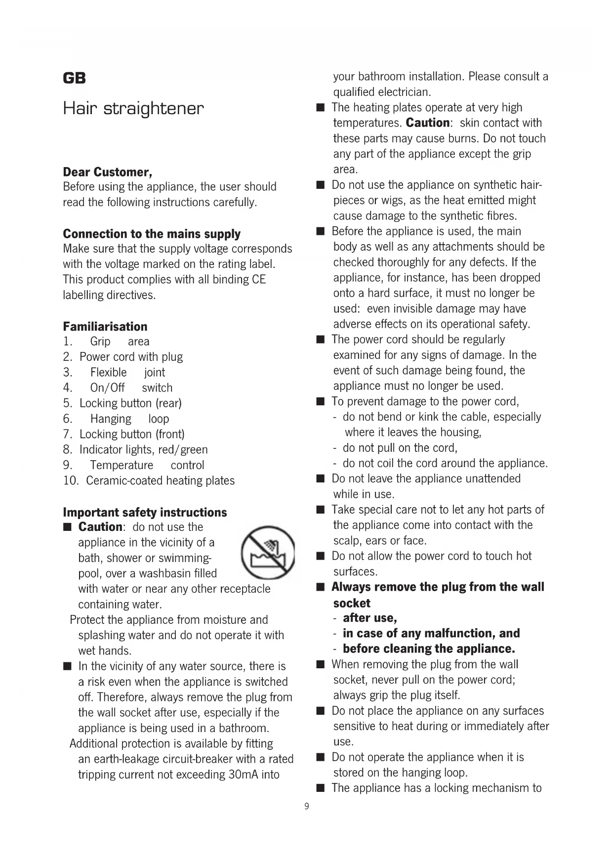 - Do not use the appliance on synthetic hairpieces or wigs, as the heat emitted might cause damage to the synthetic fibres.