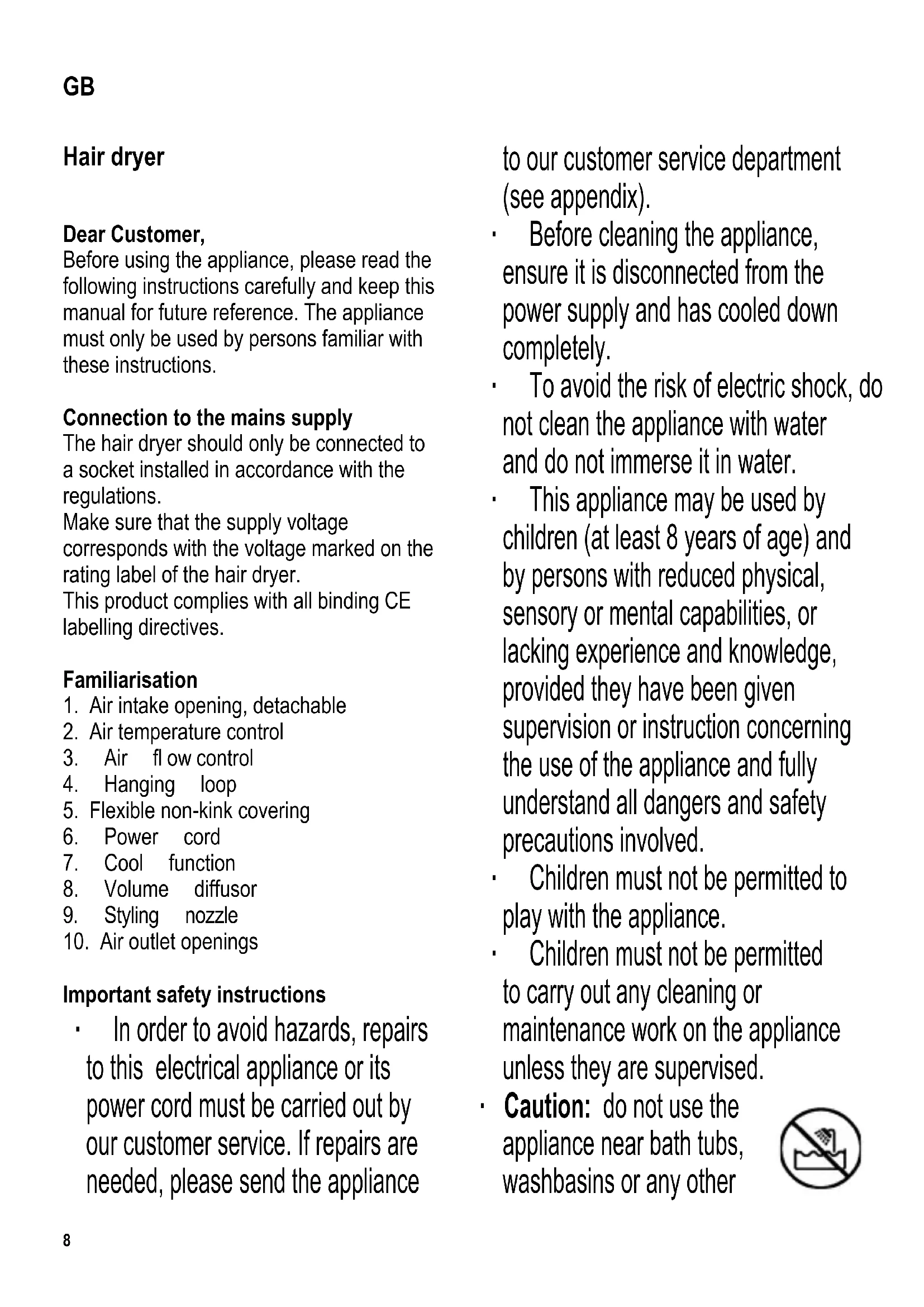 Important safety instructions ∙ In order to avoid hazards, repairs to this electrical appliance or its power cord must be carried out by our customer service. If repairs are needed, please send the appliance to our customer service department (see appendix). ∙ Before cleaning the appliance, ensure it is disconnected from the power supply and has cooled down completely. ∙ To avoid the risk of electric shock, do not clean the appliance with water and do not immerse it in water. ∙ This appliance may be used by children (at least 8 years of age) and by persons with reduced physical, sensory or mental capabilities, or lacking experience and knowledge, provided they have been given supervision or instruction concerning the use of the appliance and fully understand all dangers and safety precautions involved. ∙ Children must not be permitted to play with the appliance. ∙ Children must not be permitted to carry out any cleaning or maintenance work on the appliance unless they are supervised. ∙ Caution: do not use the appliance near bath tubs, washbasins or any other GB9 receptacle containing water. ∙ In the vicinity of any water source, there is a risk even when the appliance is switched off. Therefore, always remove the plug from the wall socket after use, especially if the appliance is being used in a bathroom. ∙ Additional protection is available by fi tting an earth-leakage circuit- breaker with a rated tripping current not exceeding 30mA into your bathroom installation. Please consult a qualifi ed electrician. ∙ Caution: Keep any packaging materials well away from children – these are a potential source of danger, e.g. of suffocation. ∙ Protect the appliance from moisture and splashing water and do not operate it with wet hands. ∙ Electric heating appliances operate at very high temperatures. Do not touch any part of the appliance except the grip. Otherwise there is a real risk of burning. ∙ Do not use the appliance on synthetic hair-pieces or wigs, as the heat emitted might cause damage to the synthetic fi bres. ∙ Make sure the air intake and outlet openings are not blocked (e.g. by fi ngers or hair), and that no fl uff or fi bre particles are allowed to accumulate in the air intake. ∙ A blockage in the air-fl ow system may cause the integral thermal safety cut-out to switch off the appliance. Should this occur, immediately disconnect the appliance from the mains power and allow suffi cient time for it to cool down before the blockage is removed and the appliance is switched on again. ∙ Every time the appliance is used, the main body including the power cord as well as any attachment fi tted should be checked thoroughly for any defects. Should the appliance, for instance, have been dropped onto a hard surface, or if excessive force has been used to pull the power cord, it must no longer be used: even invisible damage may have adverse effects on the operational safety of the appliance. ∙ To prevent damage to the power cord, - do not bend or kink the cable, especially where it leaves the housing, - do not pull on the cord, - do not coil the power cord around the appliance. ∙ Do not leave the appliance unattended while in use. ∙ Always switch off and remove the plug from the wall socket after use, and also in the event of any malfunction. ∙ When removing the plug from the wall socket, never pull on the power cord; always grip the plug itself. ∙ Do not place the appliance on any surfaces sensitive to heat during or immediately after use. ∙ No responsibility will be accepted if damage results from improper use, or if these instructions are not complied with. ∙ This appliance is intended for domestic or similar applications, such as - in shops, offi ces and other similar10 working environments, - in agricultural working environments, - by customers in hotels, motels etc. and similar establishments, - in bed-and breakfast type environments. The IONIC function The IONIC function facilitates gentle, easy hair styling by preventing a static charge in the hair. It uses the build-up of a negative ‘ion-cloud’ to prevent ‘fl yaway’ hair caused by a positive charge. The IONIC function is automatically enabled; its effect is enhanced by the ceramic-coated air outlet grille Styling nozzle The styling nozzle can be fi tted to the air outlet to facilitate shaping the hair during blow drying. Volume diffusor The volume diffusor is also fi tted to the air outlet. The volume diffusor is useful for maintaining the volume and natural look of curly hair. Move the diffusor with a slightly circular motion over the head. Air-fl ow and temperature controls By using different combinations of the air-fl ow and temperature controls, various settings are possible when drying the hair. The air-fl ow control regulates the air-fl ow intensity, while the temperature control regulates the heat of the air-fl ow. With the air-fl ow control set to the ‘0’-position, the hair-dryer is switched off. Cool function The cool function can be used at any time during the drying process. It will supply cooler air, which helps fi rming and shaping the hair. Operation Connect the hair dryer to a suitable wall socket and select the desired power setting with the switches integrated in the handle. Cleaning and care ∙ Before cleaning the hair dryer, remove the plug from the wall socket and let the appliance cool down completely. ∙ To avoid the risk of electric shock, do not clean the hair dryer with water nor immerse it in water. ∙ If necessary, the housing of the hair dryer may be wiped with a dry lint-free cloth. ∙ Always check the air intake openings for accumulated lint particles or hair and - if necessary - remove any found. ∙ To facilitate cleaning, the grille on the air intake can be removed by turning it anti-clockwise and then lifting it off. After cleaning, replace the grille and lock it by turning clockwise. Disposal Devices marked with this symbol must be disposed