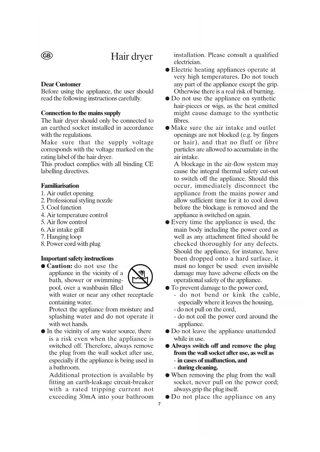 Important safety instructions ● Caution: do not use the appliance in the vicinity of a bath, shower or swimming- pool, over a washbasin filled with water or near any other receptacle containing water. Protect the appliance from moisture and splashing water and do not operate it with wet hands. ● In the vicinity of any water source, there is a risk even when the appliance is switched off. Therefore, always remove the plug from the wall socket after use, especially if the appliance is being used in a bathroom. Additional protection is available by fitting an earth-leakage circuit-breaker with a rated tripping current not exceeding 30mA into your bathroom installation. Please consult a qualified electrician. ● Electric heating appliances operate at very high temperatures. Do not touch any part of the appliance except the grip. Otherwise there is a real risk of burning. ● Do not use the appliance on synthetic hair-pieces or wigs, as the heat emitted might cause damage to the synthetic fibres. ● Make sure the air intake and outlet openings are not blocked (e.g. by fingers or hair), and that no fluff or fibre particles are allowed to accumulate in the air intake. A blockage in the air-flow system may cause the integral thermal safety cut-out to switch off the appliance. Should this occur, immediately disconnect the appliance from the mains power and allow sufficient time for it to cool down before the blockage is removed and the appliance is switched on again. ● Every time the appliance is used, the main body including the power cord as well as any attachment fitted should be checked thoroughly for any defects. Should the appliance, for instance, have been dropped onto a hard surface, it must no longer be used: even invisible damage may have adverse effects on the operational safety of the appliance. ● To prevent damage to the power cord, - do not bend or kink the cable, especially where it leaves the housing, - do not pull on the cord, - do not coil the power cord around the appliance. ● Do not leave the appliance unattended while in use. ● Always switch off and remove the plug from the wall socket after use, as well as - in cases of malfunction, and - during cleaning. ● When removing the plug from the wall socket, never pull on the power cord; always grip the plug itself. ● Do not place the appliance on any Hair dryer