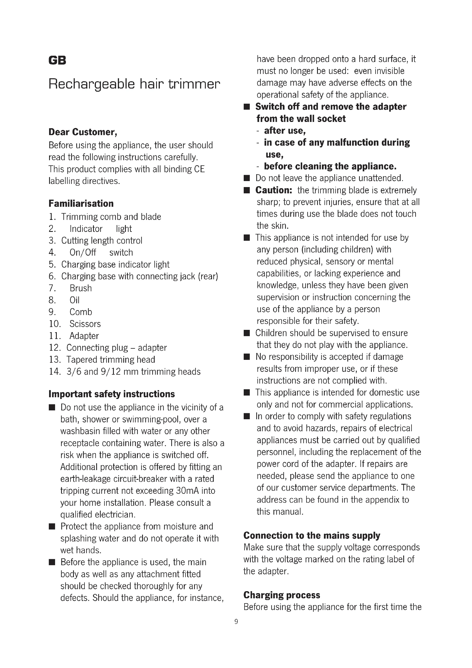 Important safety instructions ■ Do not use the appliance in the vicinity of a bath, shower or swimming-pool, over a washbasin filled with water or any other receptacle containing water. There is also a risk when the appliance is switched off. Additional protection is offered by fitting an earth-leakage circuit-breaker with a rated tripping current not exceeding 30mA into your home installation. Please consult a qualified electrician. ■ Protect the appliance from moisture and splashing water and do not operate it with wet hands. ■ Before the appliance is used, the main body as well as any attachment fitted should be checked thoroughly for any defects. Should the appliance, for instance, have been dropped onto a hard surface, it must no longer be used: even invisible damage may have adverse effects on the operational safety of the appliance. ■ Switch off and remove the adapter from the wall socket - after use, - in case of any malfunction during use, - before cleaning the appliance. ■ Do not leave the appliance unattended. ■ Caution: the trimming blade is extremely sharp; to prevent injuries, ensure that at all times during use the blade does not touch the skin. ■ This appliance is not intended for use by any person (including children) with reduced physical, sensory or mental capabilities, or lacking experience and knowledge, unless they have been given supervision or instruction concerning the use of the appliance by a person responsible for their safety. ■ Children should be supervised to ensure that they do not play with the appliance. ■ No responsibility is accepted if damage results from improper use, or if these instructions are not complied with. ■ This appliance is intended for domestic use only and not for commercial applications. ■ In order to comply with safety regulations and to avoid hazards, repairs of electrical appliances must be carried out by qualified personnel, including the replacement of the power cord of the adapter. If repairs are needed, please send the appliance to one of our customer service departments. The address can be found in the appendix to this manual. Connection to the mains supply Make sure that the supply voltage corresponds with the voltage marked on the rating label of the adapter. Charging process Before using the appliance for the first time the 9battery must be fully charged, which will take about one hour. However, the appliance can remain on charge for a longer period without damage or danger. If you experience a considerable decrease in trimming performance, or if the indicator light shows red, switch off the appliance and recharge the battery.