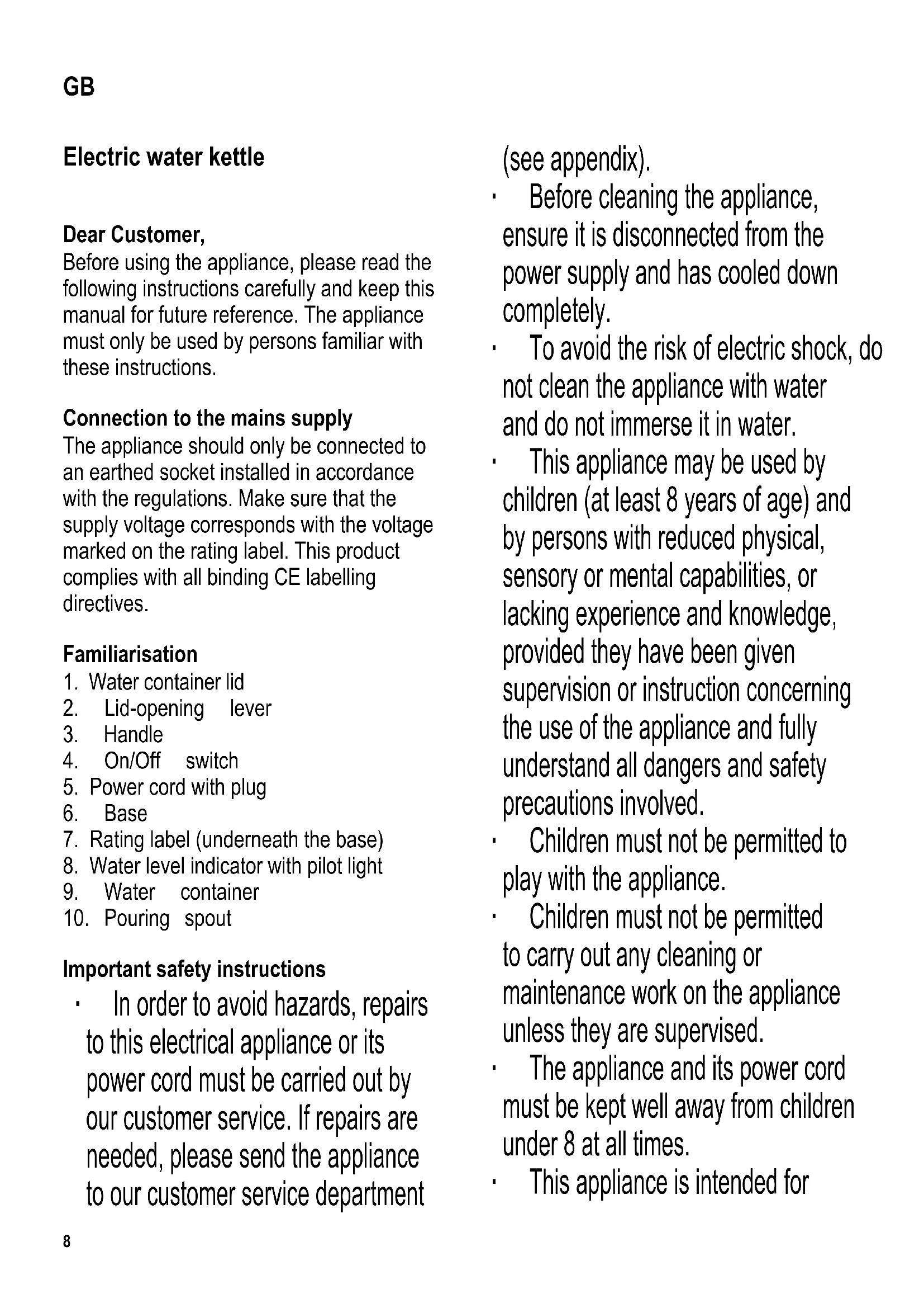 Important safety instructions ∙ In order to avoid hazards, repairs to this electrical appliance or its power cord must be carried out by our customer service. If repairs are needed, please send the appliance to our customer service department (see appendix). ∙ Before cleaning the appliance, ensure it is disconnected from the power supply and has cooled down completely. ∙ To avoid the risk of electric shock, do not clean the appliance with water and do not immerse it in water. ∙ This appliance may be used by children (at least 8 years of age) and by persons with reduced physical, sensory or mental capabilities, or lacking experience and knowledge, provided they have been given supervision or instruction concerning the use of the appliance and fully understand all dangers and safety precautions involved. ∙ Children must not be permitted to play with the appliance. ∙ Children must not be permitted to carry out any cleaning or maintenance work on the appliance unless they are supervised. ∙ The appliance and its power cord must be kept well away from children under 8 at all times. ∙ This appliance is intended for GB9 domestic or similar applications, such