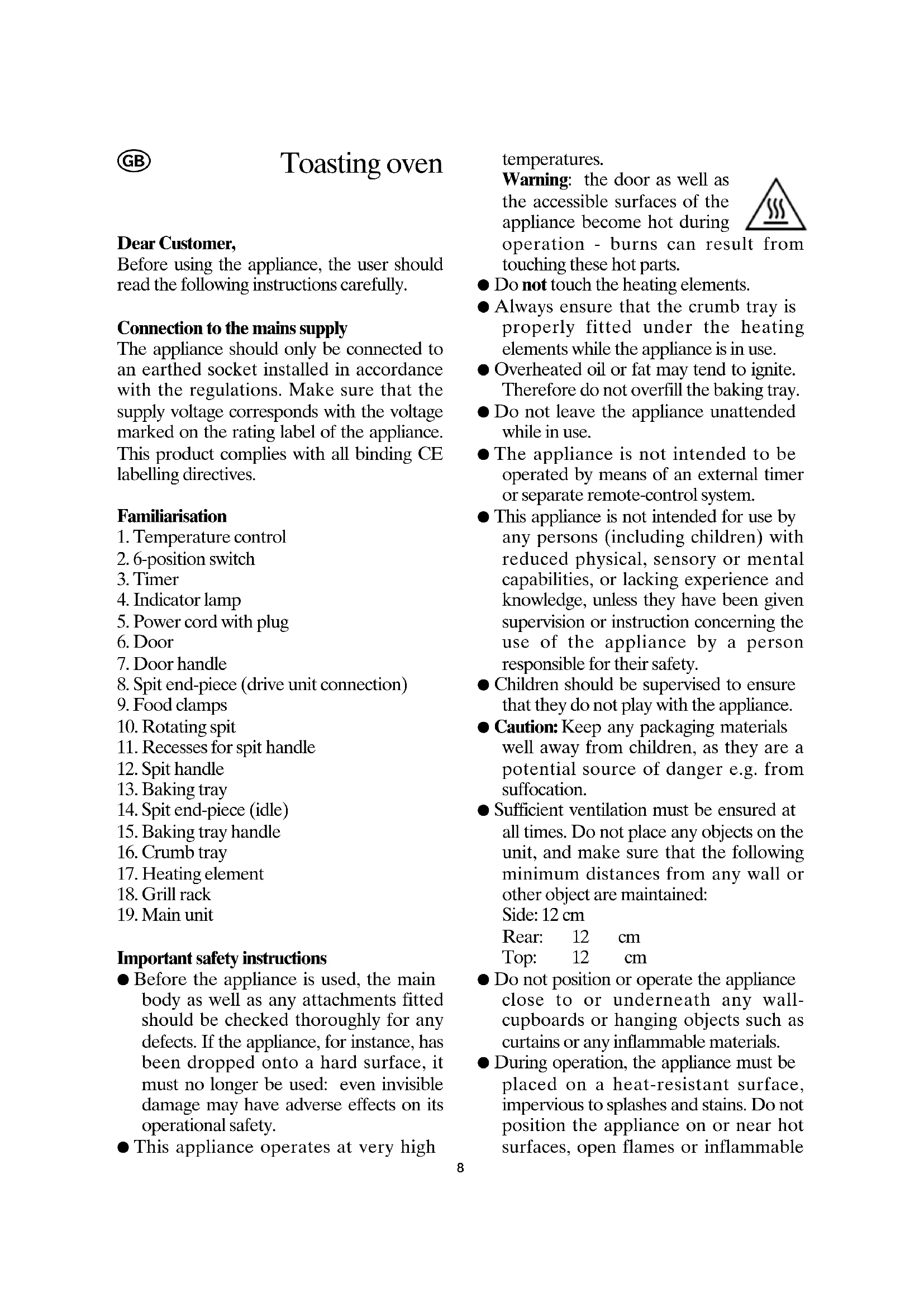 the accessible surfaces of the appliance become hot during operation - burns can result from touching these hot parts. ● Do not touch the heating elements. ● Always ensure that the crumb tray is properly fitted under the heating elements while the appliance is in use. ● Overheated oil or fat may tend to ignite. Therefore do not overfill the baking tray. ● Do not leave the appliance unattended while in use. ● The appliance is not intended to be operated by means of an external timer or separate remote-control system. ● This appliance is not intended for use by any persons (including children) with reduced physical, sensory or mental capabilities, or lacking experience and knowledge, unless they have been given supervision or instruction concerning the use of the appliance by a person responsible for their safety. ● Children should be supervised to ensure that they do not play with the appliance. ● Caution: Keep any packaging materials well away from children, as they are a potential source of danger e.g. from suffocation. ● Sufficient ventilation must be ensured at all times. Do not place any objects on the unit, and make sure that the following minimum distances from any wall or other object are maintained: Side: 12 cm Rear: 12 cm Top: 12 cm ● Do not position or operate the appliance close to or underneath any wall- cupboards or hanging objects such as curtains or any inflammable materials. ● During operation, the appliance must be placed on a heat-resistant surface, impervious to splashes and stains. Do not position the appliance on or near hot surfaces, open flames or inflammable