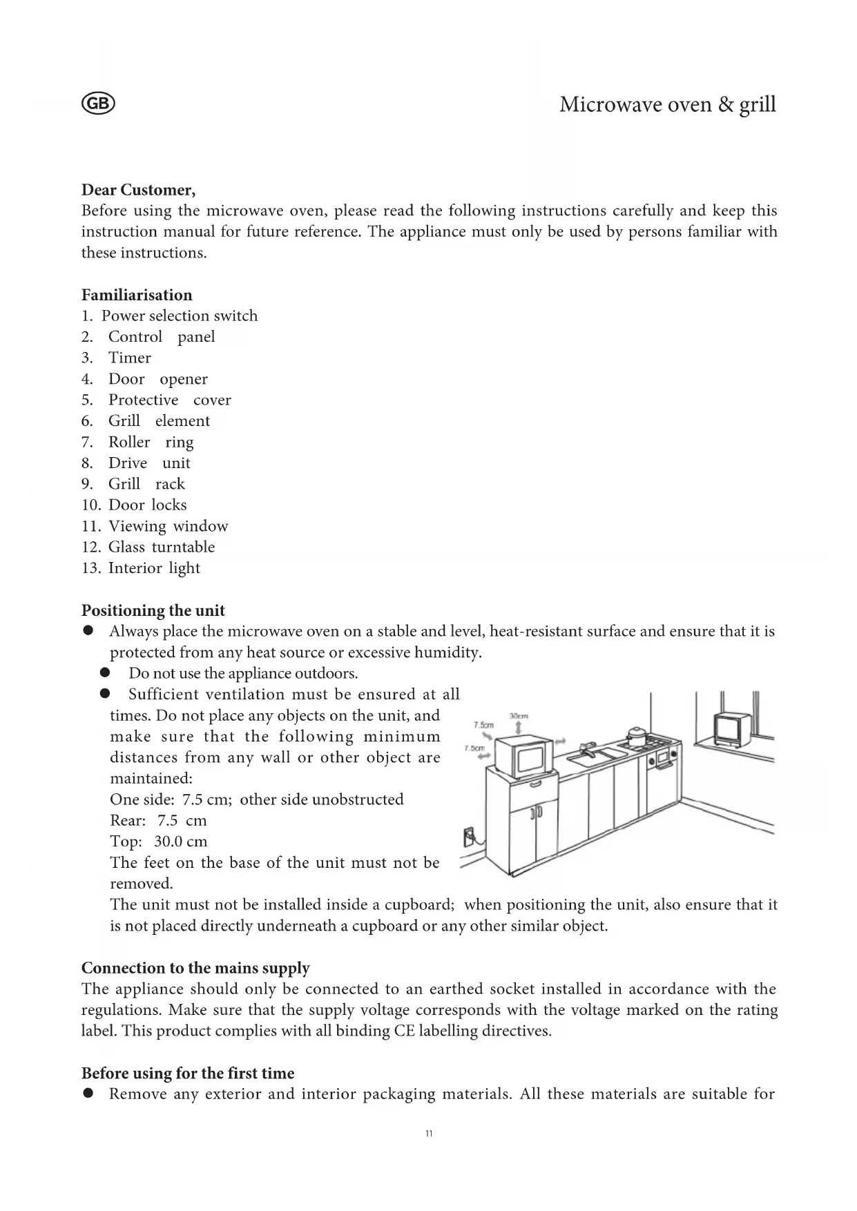 Positioning the unit Always place the microwave oven on a stable and level, heat-resistant surface and ensure that it is protected from any heat source or excessive humidity. Do not use the appliance outdoors. Sufficient ventilation must be ensured at all times. Do not place any objects on the unit, and make sure that the following minimum distances from any wall or other object are maintained: One side: 7.5 cm; other side unobstructed Rear: 7.5 cm Top: 30.0 cm The feet on the base of the unit must not be removed. The unit must not be installed inside a cupboard; when positioning the unit, also ensure that it is not placed directly underneath a cupboard or any other similar object. Connection to the mains supply The appliance should only be connected to an earthed socket installed in accordance with the regulations. Make sure that the supply voltage corresponds with the voltage marked on the rating label. This product complies with all binding CE labelling directives. Before using for the first time Remove any exterior and interior packaging materials. All these materials are suitable for