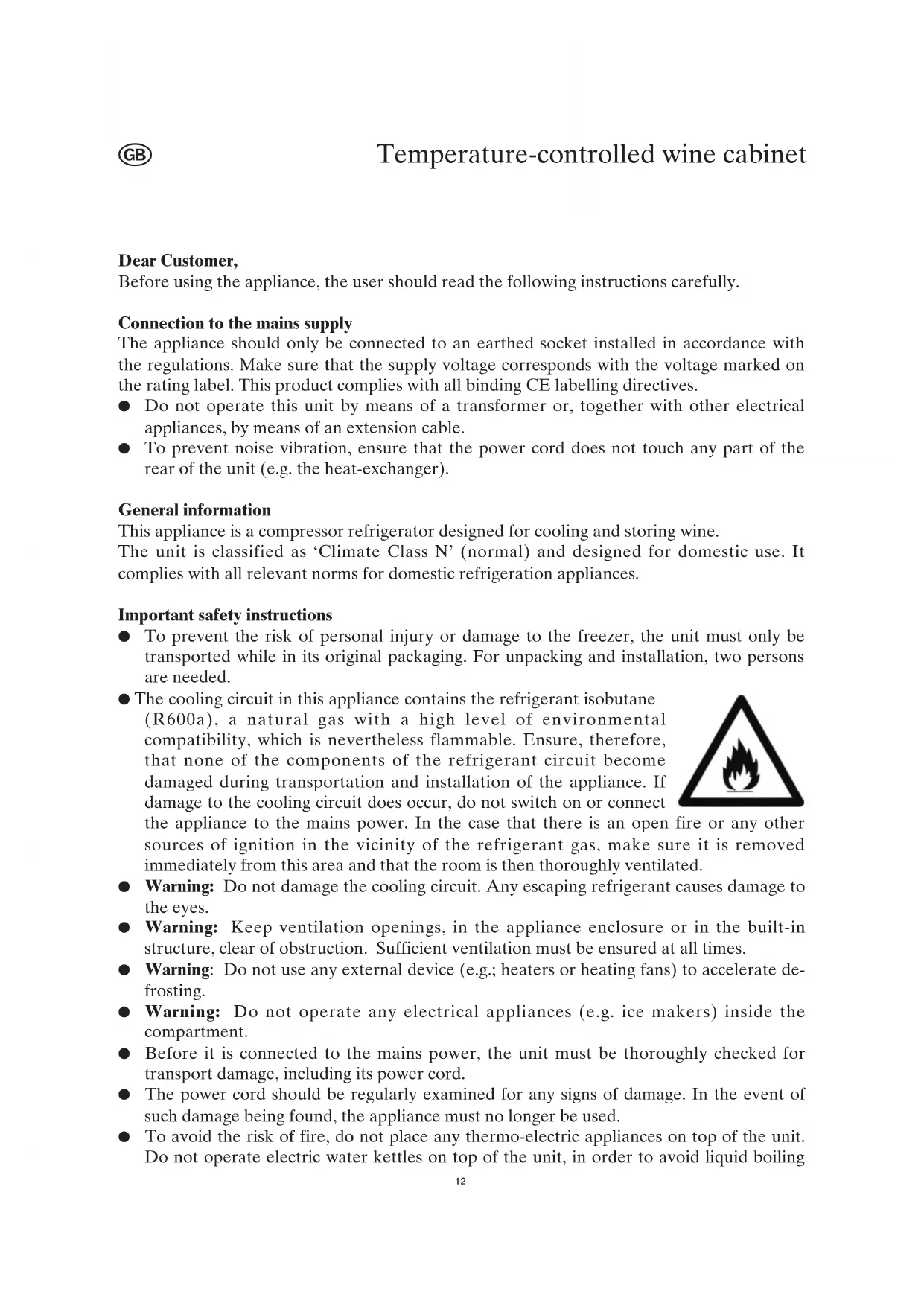 - The cooling circuit in this appliance contains the refrigerant isobutane (R600a), a natural gas with a high level of environmental compatibility, which is nevertheless flammable. Ensure, therefore, that none of the components of the refrigerant circuit become damaged during transportation and installation of the appliance. If damage to the cooling circuit does occur, do not switch on or connect