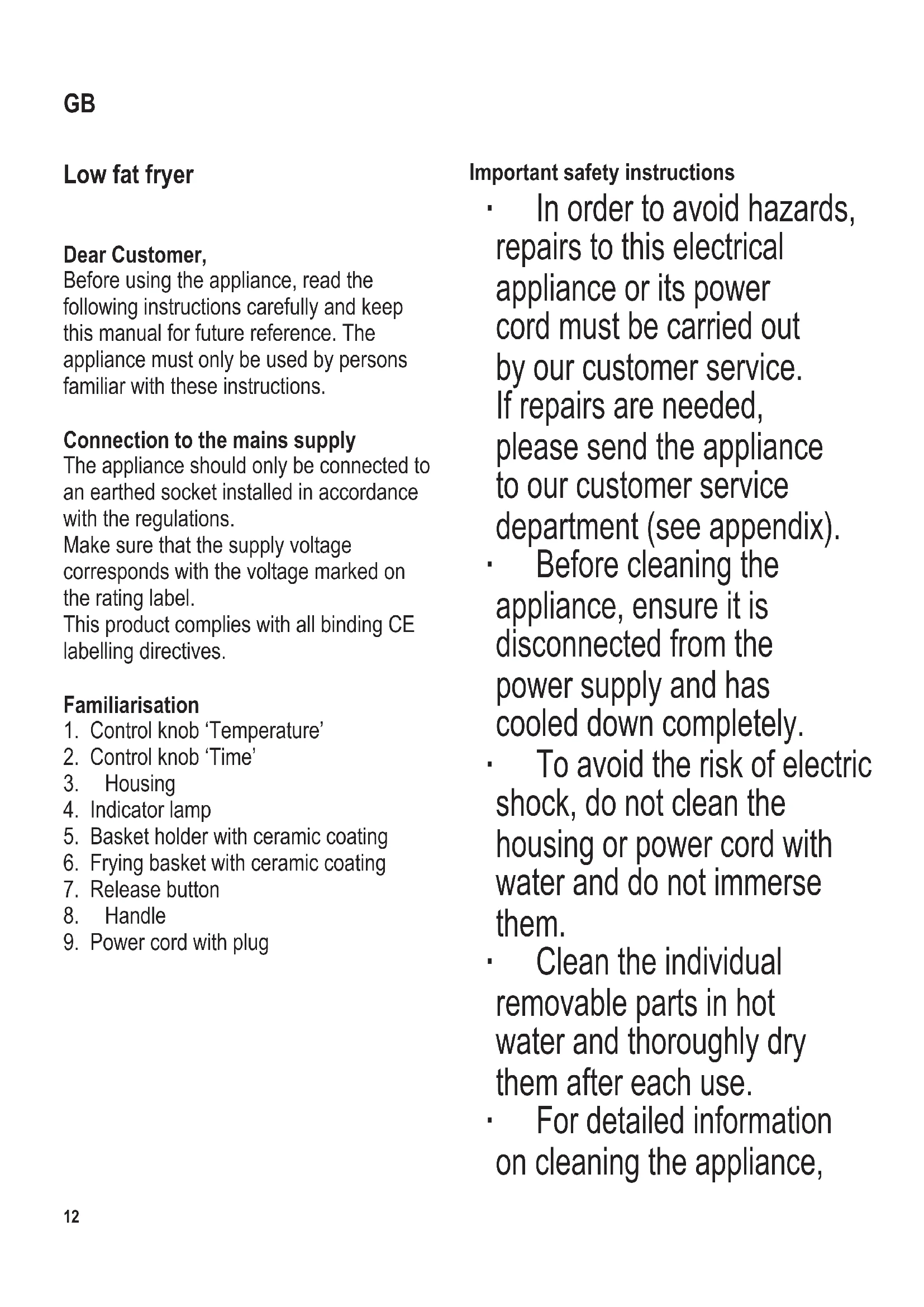 Important safety instructions ∙ In order to avoid hazards, repairs to this electrical appliance or its power cord must be carried out by our customer service. If repairs are needed, please send the appliance to our customer service department (see appendix). ∙ Before cleaning the appliance, ensure it is disconnected from the power supply and has cooled down completely. ∙ To avoid the risk of electric shock, do not clean the housing or power cord with water and do not immerse them. ∙ Clean the individual removable parts in hot water and thoroughly dry them after each use. ∙ For detailed information on cleaning the appliance, GB104 x 142 mm