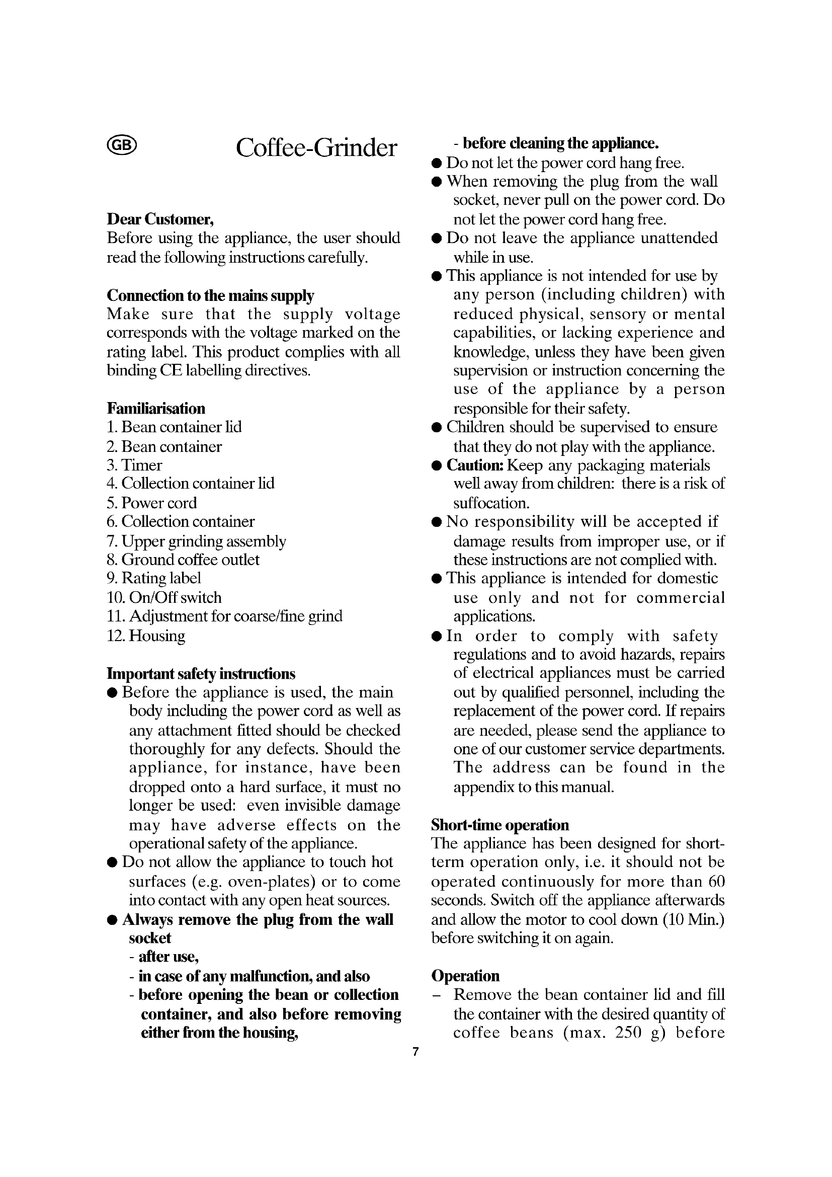 Important safety instructions ● Before the appliance is used, the main body including the power cord as well as any attachment fitted should be checked thoroughly for any defects. Should the appliance, for instance, have been dropped onto a hard surface, it must no longer be used: even invisible damage may have adverse effects on the operational safety of the appliance. ● Do not allow the appliance to touch hot surfaces (e.g. oven-plates) or to come into contact with any open heat sources. ● Always remove the plug from the wall socket - after use, - in case of any malfunction, and also - before opening the bean or collection container, and also before removing either from the housing, - before cleaning the appliance. ● Do not let the power cord hang free. ● When removing the plug from the wall socket, never pull on the power cord. Do not let the power cord hang free. ● Do not leave the appliance unattended while in use. ● This appliance is not intended for use by any person (including children) with reduced physical, sensory or mental capabilities, or lacking experience and knowledge, unless they have been given supervision or instruction concerning the use of the appliance by a person responsible for their safety. ● Children should be supervised to ensure that they do not play with the appliance. ● Caution: Keep any packaging materials well away from children: there is a risk of suffocation. ● No responsibility will be accepted if damage results from improper use, or if these instructions are not complied with. ● This appliance is intended for domestic use only and not for commercial applications. ● In order to comply with safety regulations and to avoid hazards, repairs of electrical appliances must be carried out by qualified personnel, including the replacement of the power cord. If repairs are needed, please send the appliance to one of our customer service departments. The address can be found in the appendix to this manual. Short-time operation The appliance has been designed for short- term operation only, i.e. it should not be operated continuously for more than 60 seconds. Switch off the appliance afterwards and allow the motor to cool down (10 Min.) before switching it on again. Operation