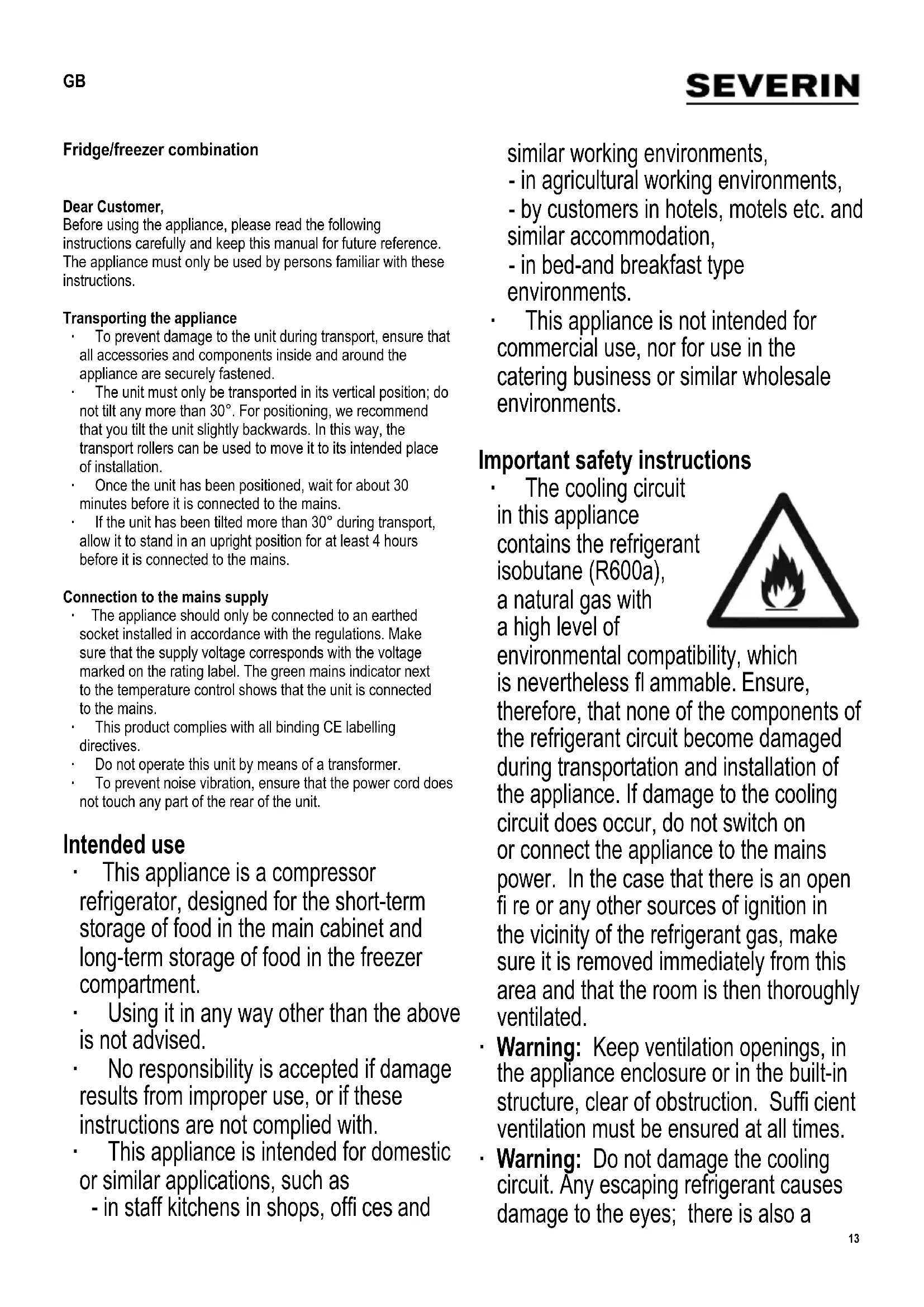 - Gemäß Verordnung (EU) Nr. 1060/2010 Anhang III ** Der tatsächliche Verbrauch hängt von der Nutzung und vom Standort des Gerätes ab13 Fridge/freezer combination Dear Customer, Before using the appliance, please read the following instructions carefully and keep this manual for future reference. The appliance must only be used by persons familiar with these instructions. Transporting the appliance ∙ To prevent damage to the unit during transport, ensure that all accessories and components inside and around the appliance are securely fastened. ∙ The unit must only be transported in its vertical position; do not tilt any more than 30°. For positioning, we recommend that you tilt the unit slightly backwards. In this way, the transport rollers can be used to move it to its intended place of installation. ∙ Once the unit has been positioned, wait for about 30 minutes before it is connected to the mains. ∙ If the unit has been tilted more than 30° during transport, allow it to stand in an upright position for at least 4 hours before it is connected to the mains. Connection to the mains supply ∙ The appliance should only be connected to an earthed socket installed in accordance with the regulations. Make sure that the supply voltage corresponds with the voltage marked on the rating label. The green mains indicator next to the temperature control shows that the unit is connected to the mains. ∙ This product complies with all binding CE labelling directives. ∙ Do not operate this unit by means of a transformer. ∙ To prevent noise vibration, ensure that the power cord does not touch any part of the rear of the unit. Intended use ∙ This appliance is a compressor refrigerator, designed for the short-term storage of food in the main cabinet and long-term storage of food in the freezer compartment. ∙ Using it in any way other than the above is not advised. ∙ No responsibility is accepted if damage results from improper use, or if these instructions are not complied with. ∙ This appliance is intended for domestic or similar applications, such as - in staff kitchens in shops, offi ces and similar working environments, - in agricultural working environments, - by customers in hotels, motels etc. and similar accommodation, - in bed-and breakfast type environments. ∙ This appliance is not intended for commercial use, nor for use in the catering business or similar wholesale environments. Important safety instructions ∙ The cooling circuit in this appliance contains the refrigerant isobutane (R600a), a natural gas with a high level of environmental compatibility, which is nevertheless fl ammable. Ensure, therefore, that none of the components of the refrigerant circuit become damaged during transportation and installation of the appliance. If damage to the cooling circuit does occur, do not switch on or connect the appliance to the mains power. In the case that there is an open fi re or any other sources of ignition in the vicinity of the refrigerant gas, make sure it is removed immediately from this area and that the room is then thoroughly ventilated. ∙ Warning: Keep ventilation openings, in the appliance enclosure or in the built-in structure, clear of obstruction. Suffi cient ventilation must be ensured at all times. ∙ Warning: Do not damage the cooling circuit. Any escaping refrigerant causes damage to the eyes; there is also a GB14 danger of the gas igniting. ∙ Warning: Do n ot use any external device (e.g. heaters or heating fans) to accelerate de-frosting; follow only the methods recommended in this manual. ∙ Warning: Do not operate any electrical appliances (e.g. ice makers) inside the storage compartment that are not specifi cally permitted in these instructions. ∙ Before it is connected to the mains power, the unit must be thoroughly checked for transport damage, including its power cord. In the event of any such damage being found, the appliance must not be connected to the mains. ∙ This appliance is not designed for the storage of explosive substances such as aerosol cans with a fl ammable propellant. ∙ If the unit is sold, handed over to a third party or disposed of at a suitable recycling facility, attention must be drawn to the presence of the insulation agent ‘cyclopenthane’ as well as to the refrigerant R600a. For additional information on correct recycling please refer to the Disposal section. ∙ In order to comply with safety regulations and to avoid hazards, any repairs or modifi cations to this unit must be carried out by our authorised service personnel, including the replacement of the power cord. ∙ This appliance may be used by children (at least 8 years of age) and by persons with reduced physical, sensory or mental capabilities, or lacking experience and knowledge, provided they have been given supervision or instruction concerning the use of the appliance and fully understand all dangers and safety precautions involved. ∙ Children must not be permitted to play with the appliance. ∙ Children must not be permitted to carry out any cleaning or maintenance work on the appliance. ∙ For frequent cleaning we recommend the use of warm water with some mild detergent. For detailed information on cleaning the appliance, please refer to the section De-frosting and cleaning. ∙ Caution: Do not remove the cover of the interior LED light. If there should be any malfunction, please contact the customer service for assistance (see appendix). ∙ To prevent the risk of personal injury or damage to the unit, it must only be transported while in its original packaging. Two people are required for unpacking and installation. ∙ Caution: Keep any packaging materials well away from children: there is a risk of suffocation. ∙ The ice removed from the unit during de-frosting or cleaning is not suitable for human consumption. ∙ The power cord should be regularly examined for any signs of damage. In the event of such damage being found, th