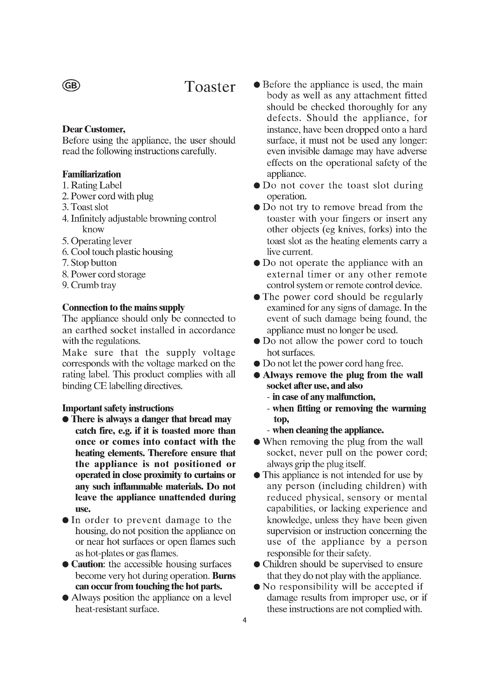 Connection to the mains supply The appliance should only be connected to an earthed socket installed in accordance with the regulations. Make sure that the supply voltage corresponds with the voltage marked on the rating label. This product complies with all binding CE labelling directives. Important safety instructions ● There is always a danger that bread may catch fire, e.g. if it is toasted more than once or comes into contact with the heating elements. Therefore ensure that the appliance is not positioned or operated in close proximity to curtains or any such inflammable materials. Do not leave the appliance unattended during use. ● In order to prevent damage to the housing, do not position the appliance on or near hot surfaces or open flames such as hot-plates or gas flames. ● Caution: the accessible housing surfaces become very hot during operation. Burns can occur from touching the hot parts. ● Always position the appliance on a level heat-resistant surface. ● Before the appliance is used, the main body as well as any attachment fitted should be checked thoroughly for any defects. Should the appliance, for instance, have been dropped onto a hard surface, it must not be used any longer: even invisible damage may have adverse effects on the operational safety of the appliance. ● Do not cover the toast slot during operation. ● Do not try to remove bread from the toaster with your fingers or insert any other objects (eg knives, forks) into the toast slot as the heating elements carry a live current. ● Do not operate the appliance with an external timer or any other remote control system or remote control device. ● The power cord should be regularly examined for any signs of damage. In the event of such damage being found, the appliance must no longer be used. ● Do not allow the power cord to touch hot surfaces. ● Do not let the power cord hang free. ● Always remove the plug from the wall socket after use, and also - in case of any malfunction, - when fitting or removing the warming top, - when cleaning the appliance. ● When removing the plug from the wall socket, never pull on the power cord; always grip the plug itself. ● This appliance is not intended for use by any person (including children) with reduced physical, sensory or mental capabilities, or lacking experience and knowledge, unless they have been given supervision or instruction concerning the use of the appliance by a person responsible for their safety. ● Children should be supervised to ensure that they do not play with the appliance. ● No responsibility will be accepted if damage results from improper use, or if these instructions are not complied with.