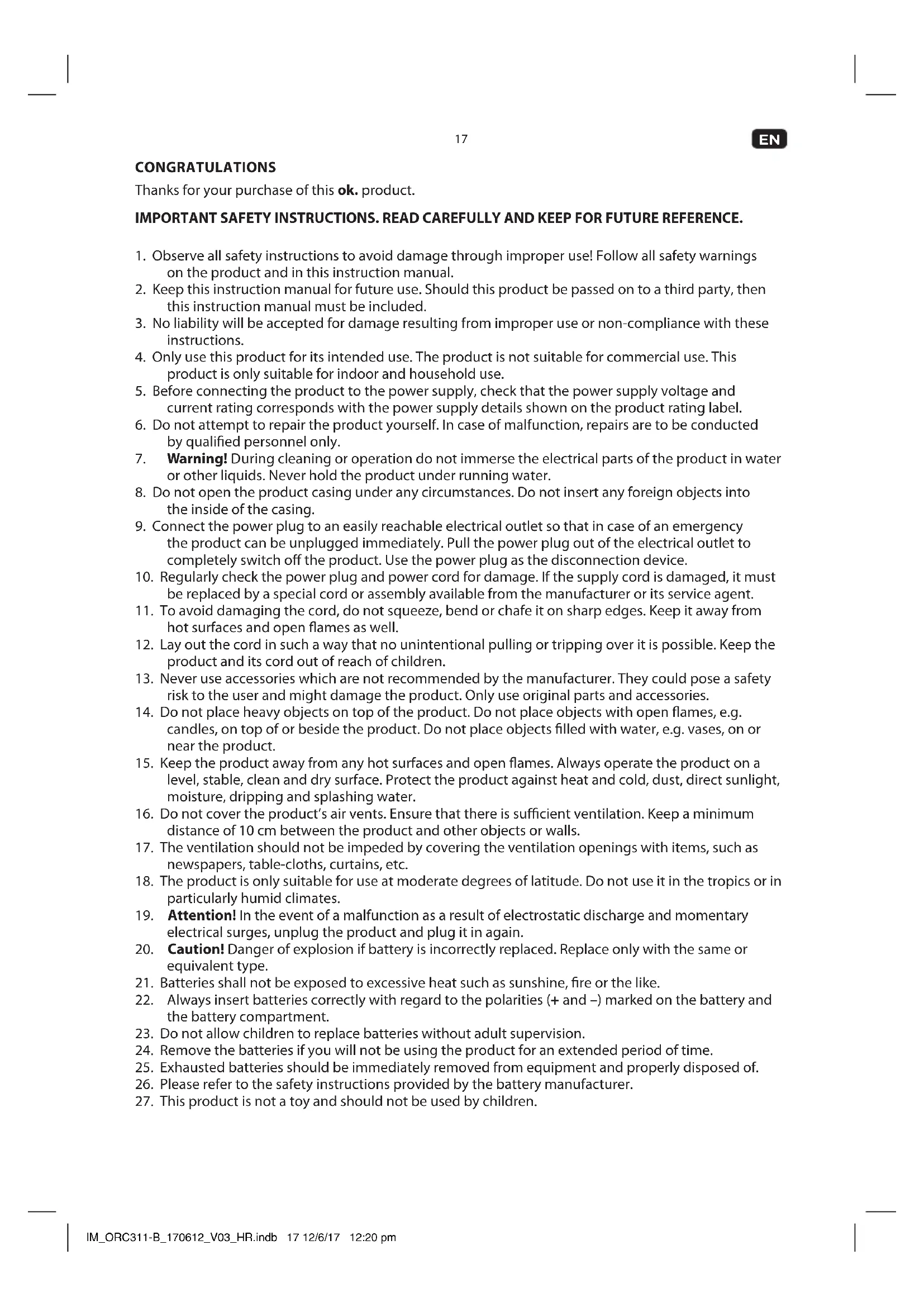 CONGRATULATIONS Thanks for your purchase of this ok. product. IMPORTANT SAFETY INSTRUCTIONS. READ CAREFULLY AND KEEP FOR FUTURE REFERENCE.