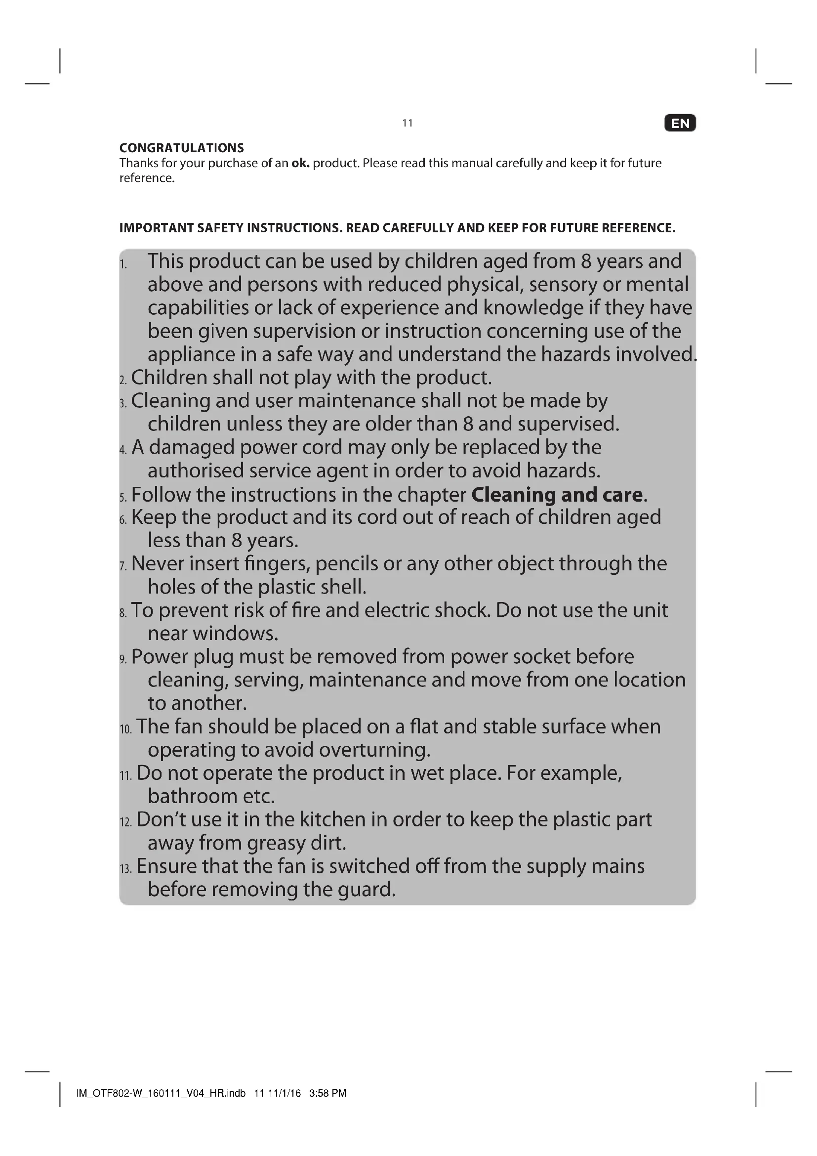 CONGRATULATIONS Thanks for your purchase of an ok. product. Please read this manual carefully and keep it for future reference. IMPORTANT SAFETY INSTRUCTIONS. READ CAREFULLY AND KEEP FOR FUTURE REFERENCE.