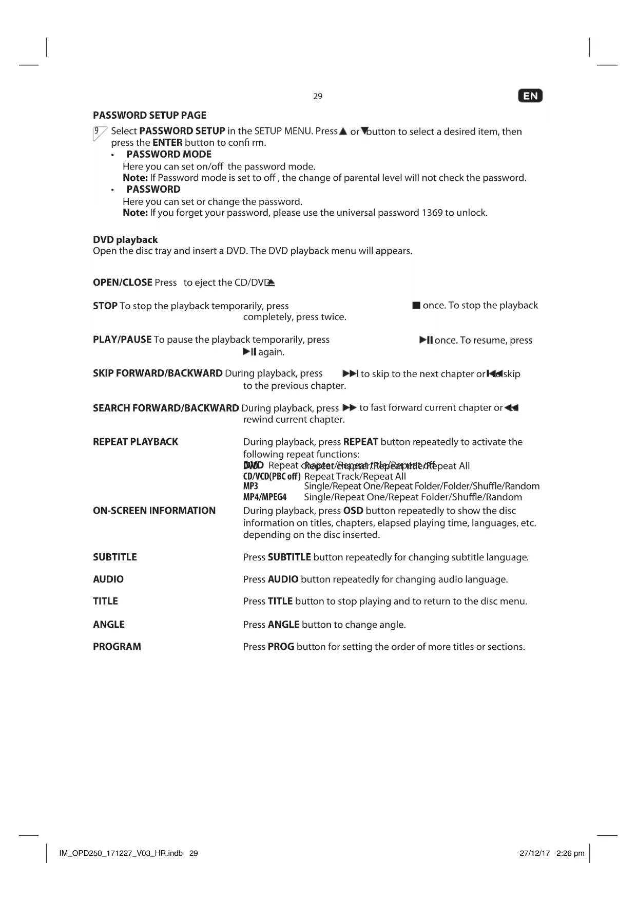 - PASSWORD Here you can set or change the password. Note: If you forget your password, please use the universal password 1369 to unlock. DVD playback Open the disc tray and insert a DVD. The DVD playback menu will appears. OPEN/CLOSE Press to eject the CD/DVD. STOP To stop the playback temporarily, press once. To stop the playback completely, press twice. PLAY/PAUSE To pause the playback temporarily, press once. To resume, press again. SKIP FORWARD/BACKWARD During playback, press to skip to the next chapter or to skip to the previous chapter. SEARCH FORWARD/BACKWARD During playback, press to fast forward current chapter or to rewind current chapter. REPEAT PLAYBACK During playback, press REPEAT button repeatedly to activate the following repeat functions: DVD Repeat chapter/Repeat title/Repeat o CD/VCD(PBC off ) Repeat single/Repeat all/Repeat o MP3/MP4/MPEG4 Repeat single/Repeat folder/Repeat o ON-SCREEN INFORMATION During playback, press OSD button repeatedly to show the disc information on titles, chapters, elapsed playing time, languages, etc. depending on the disc inserted. SUBTITLE Press SUBTITLE button repeatedly for changing subtitle language. AUDIO Press AUDIO button repeatedly for changing audio language. TITLE Press TITLE button to stop playing and to return to the disc menu. ANGLE Press ANGLE button to change angle. PROGRAM Press PROG button for setting the order of more titles or sections. DVD Repeat chapter/Repeat title/Repeat All CD/VCD(PBC o) Repeat Track/Repeat All MP3 Single/Repeat One/Repeat Folder/Folder/Shue/Random MP4/MPEG4 Single/Repeat One/Repeat Folder/Shue/Random IM_OPD250_171227_V03_HR.indb 29 27/12/17 2:26 pm30