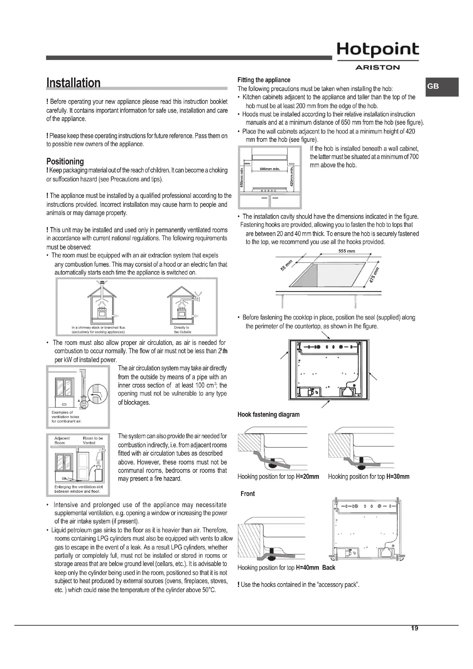 - Gas appliances require regular air exchange to maintain efcient operation. When installing the hob, follow the instructions provided in the paragraph on “Positioning” the appliance.