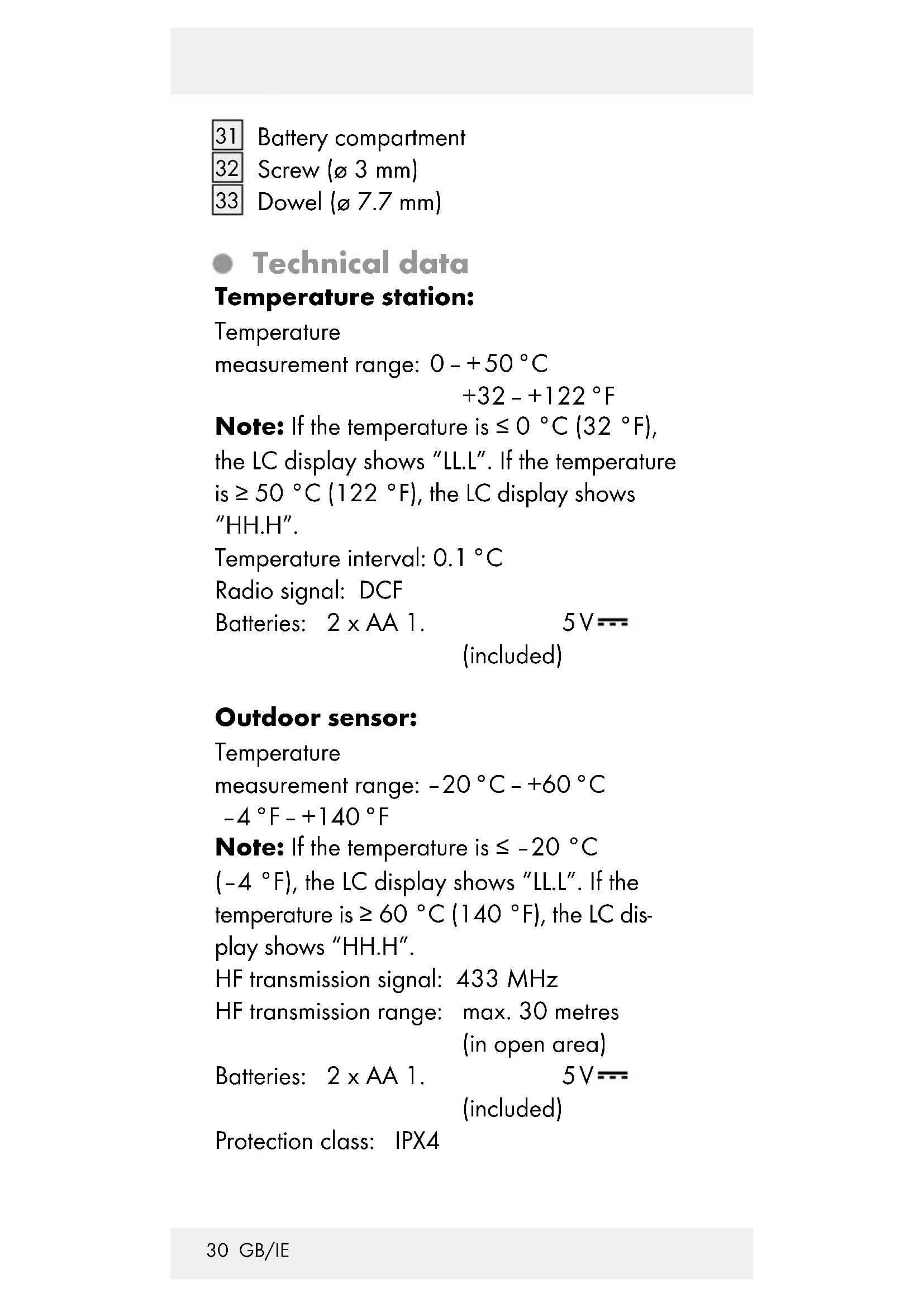 Technical data Temperature station: Temperature measurement range: 0 – + 50 °C +32 – +122 °F Note: If the temperature is ≤0 °C (32 °F), the LC display shows “LL.L”. If the temperature is ≥50 °C (122 °F), the LC display shows “HH.H”. Temperature interval: 0.1 °C Radio signal: DCF Batteries: 2 x AA 1. 5 V (included) Outdoor sensor: Temperature measurement range: –20 °C – +60 °C –4 °F – +140 °F Note: If the temperature is ≤–20 °C (–4 °F), the LC display shows “LL.L”. If the temperature is ≥60 °C (140 °F), the LC dis- play shows “HH.H”. HF transmission signal: 433 MHz HF transmission range: max. 30 metres (in open area) Batteries: 2 x AA 1. 5 V (included) Protection class: IPX431 GB/IE Safety