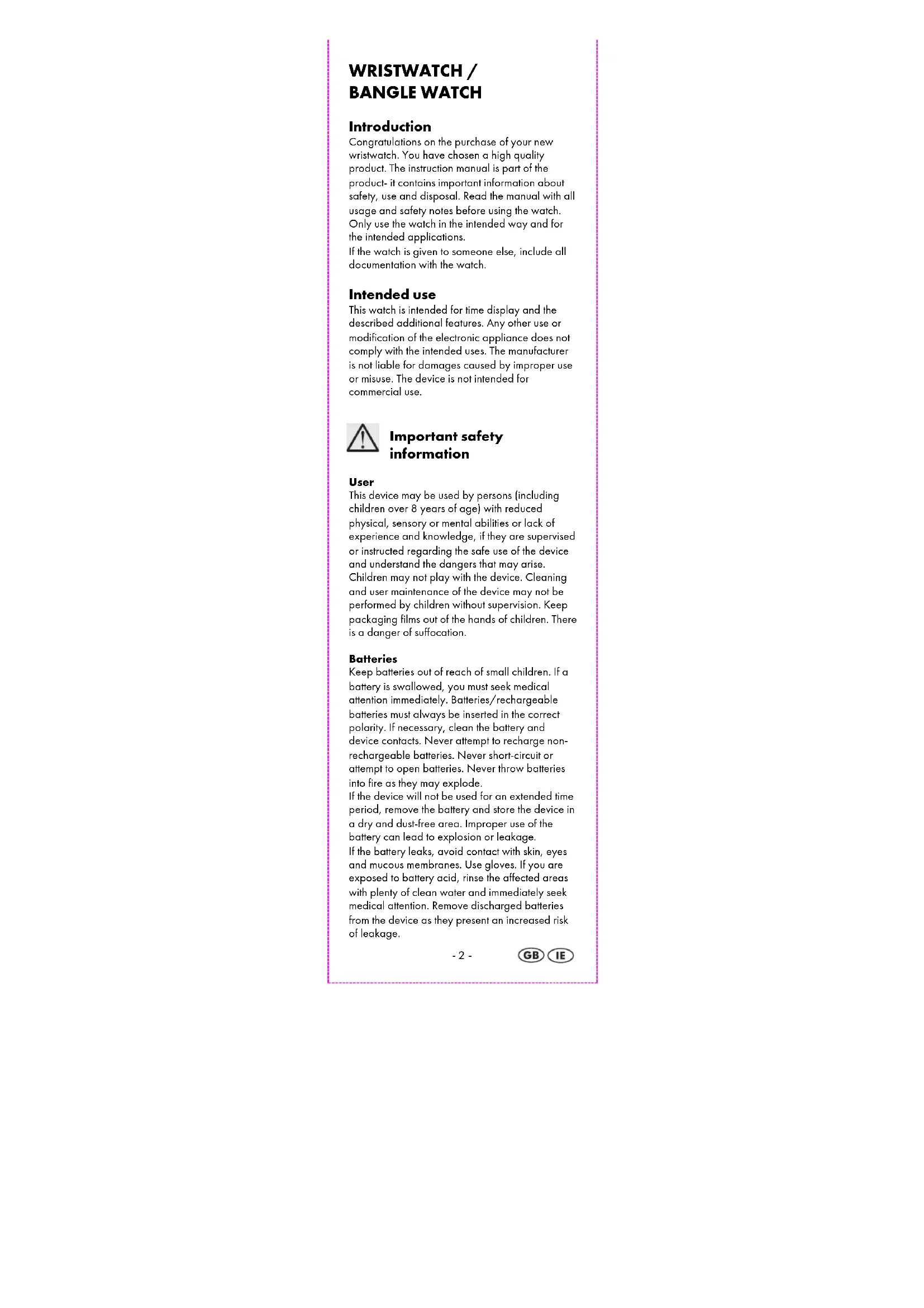 WRISTWATCH / BANGLE WATCH Introduction Congratulations on the purchase of your new wristwatch. You have chosen a high quality product. The instruction manual is part of the product- it contains important information about safety, use and disposal. Read the manual with all usage and safety notes before using the watch. Only use the watch in the intended way and for the intended applications. If the watch is given to someone else, include all documentation with the watch. Intended use This watch is intended for time display and the described additional features. Any other use or modification of the electronic appliance does not comply with the intended uses. The manufacturer is not liable for damages caused by improper use or misuse. The device is not intended for commercial use.