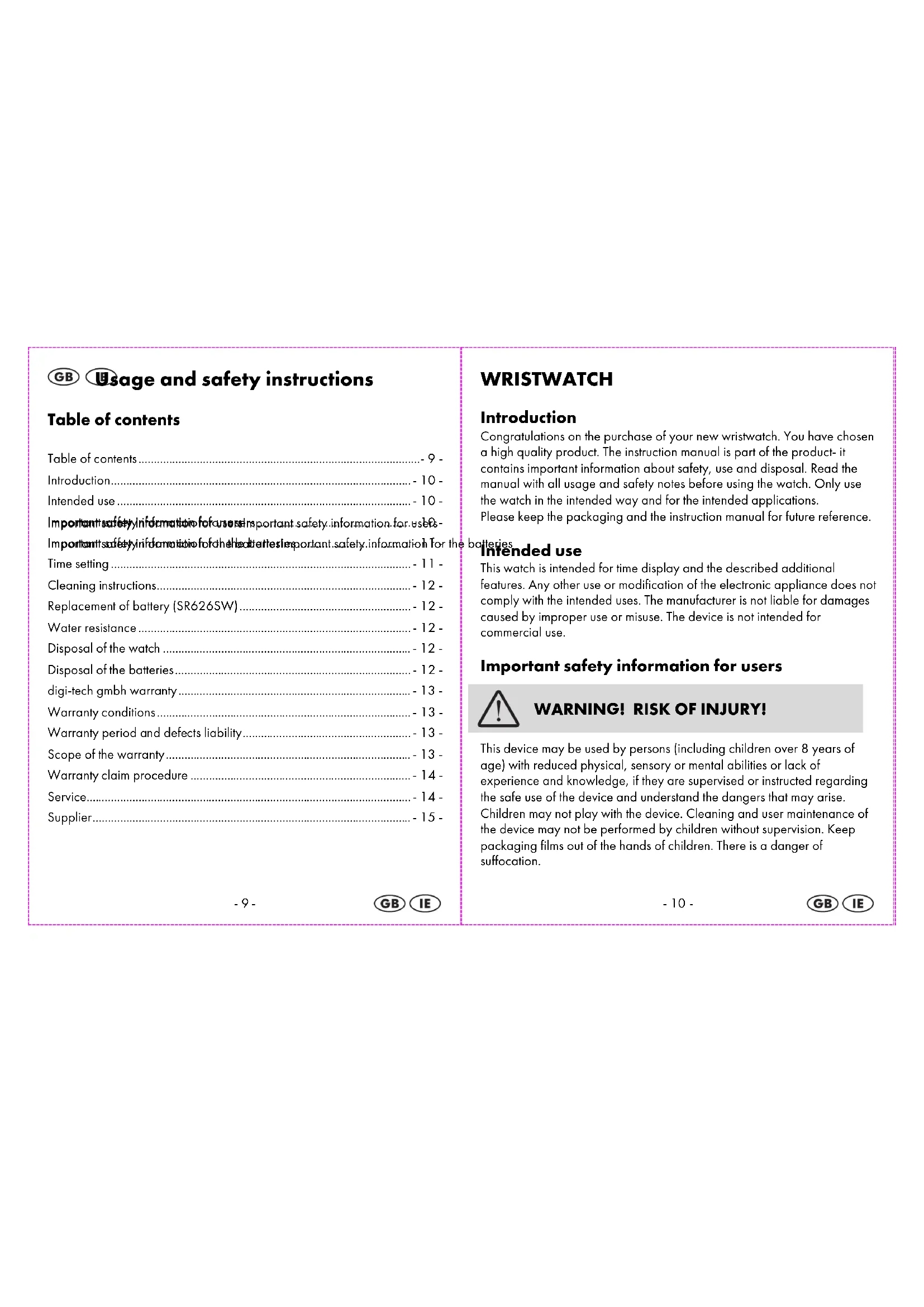 WRISTWATCH Introduction Congratulations on the purchase of your new wristwatch. You have chosen a high quality product. The instruction manual is part of the product- it contains important information about safety, use and disposal. Read the manual with all usage and safety notes before using the watch. Only use the watch in the intended way and for the intended applications. Please keep the packaging and the instruction manual for future reference. Intended use This watch is intended for time display and the described additional features. Any other use or modification of the electronic appliance does not comply with the intended uses. The manufacturer is not liable for damages caused by improper use or misuse. The device is not intended for commercial use. Important safety information for users