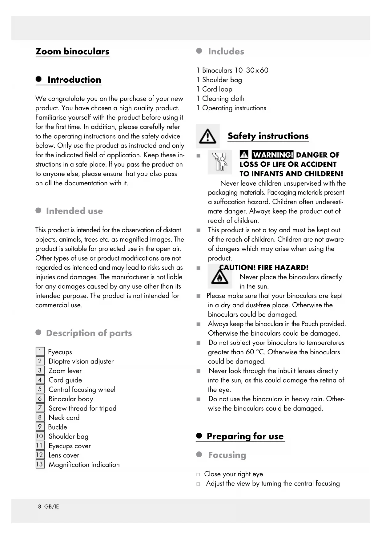 lichen Teilen, z. B. Schalter, Akkus oder die aus Glas gefertigt sind.8 GB/IE Zoom binoculars Introduction We congratulate you on the purchase of your new product. You have chosen a high quality product. Familiarise yourself with the product before using it for the first time. In addition, please carefully refer to the operating instructions and the safety advice below. Only use the product as instructed and only for the indicated field of application. Keep these in- structions in a safe place. If you pass the product on to anyone else, please ensure that you also pass on all the documentation with it.