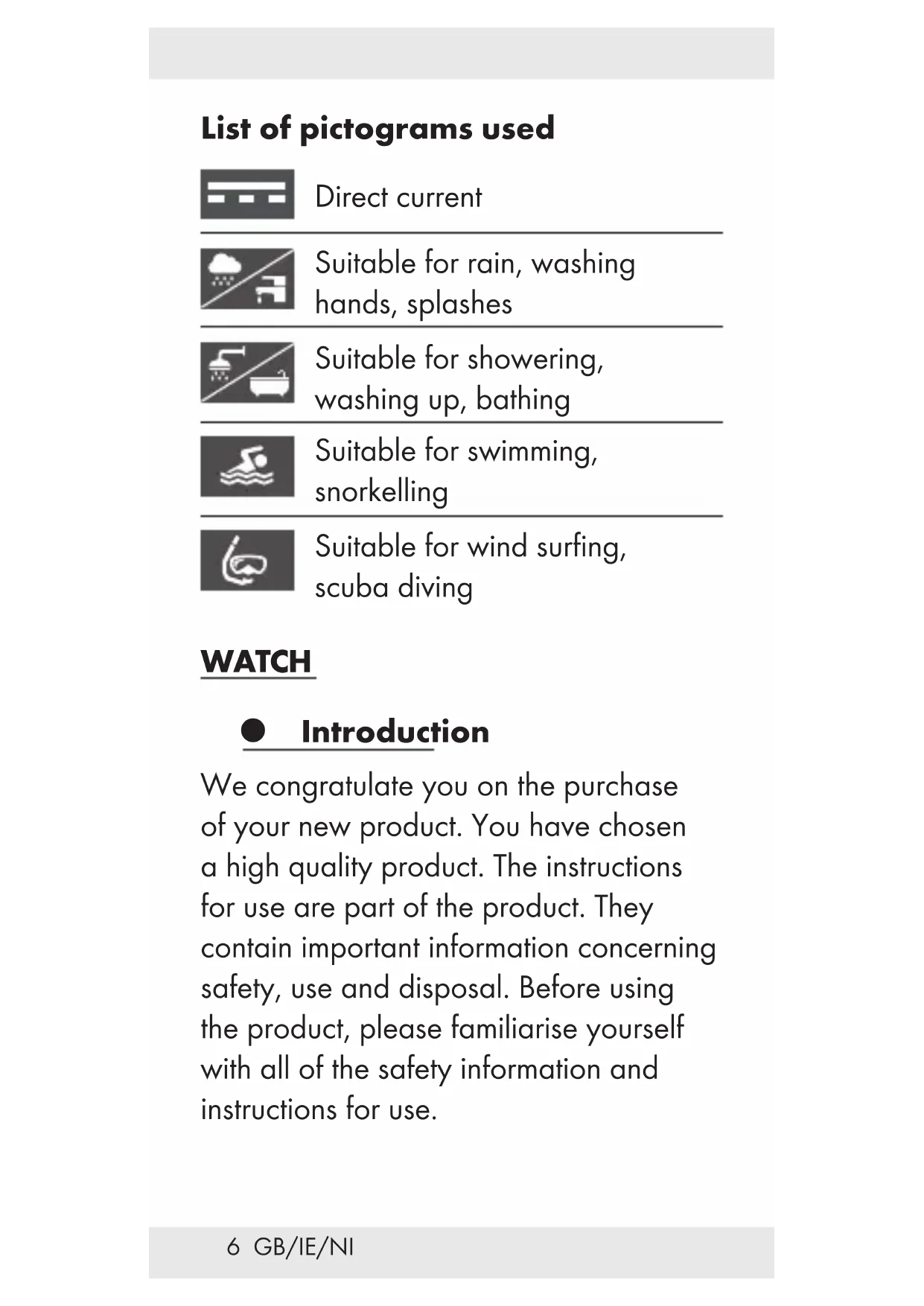 - Warranty GB/IE/NI List of pictograms used Direct current Suitable for rain, washing hands, splashes Suitable for showering, washing up, bathing Suitable for swimming, snorkelling Suitable for wind surfing, scuba diving WATCH Introduction We congratulate you on the purchase of your new product. You have chosen a high quality product. The instructions for use are part of the product. They contain important information concerning safety, use and disposal. Before using the product, please familiarise yourself with all of the safety information and instructions for use.7 GB/IE/NI Only use the product as described and for the specified applications. If you pass the product on to anyone else, please ensure that you also pass on all the documentation with it. Intended use The product is intended for consumer use only and must not be used in commercial areas. Description of parts p. 136