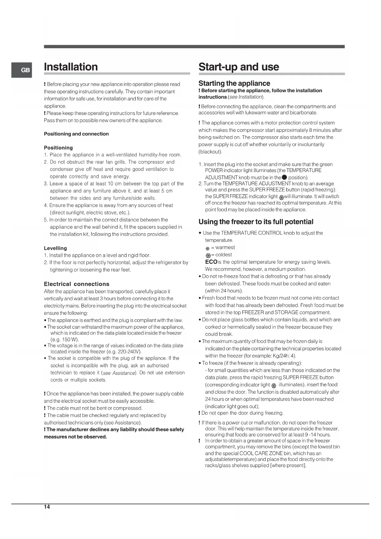 Installation ! Before placing your new appliance into operation please readthese operating instructions carefully. They contain importantinformation for safe use, for installation and for care of theappliance. ! Please keep these operating instructions for future reference. Pass them on to possible new owners of the appliance.Positioning and connectionPositioning1. Place the appliance in a well-ventilated humidity-free room.2. Do not obstruct the rear fan grills. The compressor andcondenser give off heat and require good ventilation tooperate correctly and save energy.3. Leave a space of at least 10 cm between the top part of theappliance and any furniture above it, and at least 5 cmbetween the sides and any furniture/side walls.4. Ensure the appliance is away from any sources of heat(direct sunlight, electric stove, etc.).5. In order to maintain the correct distance between theappliance and the wall behind it, fit the spacers supplied inthe installation kit, following the instructions provided.Levelling1. Install the appliance on a level and rigid floor.2. If the floor is not perfectly horizontal, adjust the refrigerator bytightening or loosening the rear feet. Electrical connections After the appliance has been transported, carefully place itvertically and wait at least 3 hours before connecting it to theelectricity mains. Before inserting the plug into the electrical socketensure the following:• The appliance is earthed and the plug is compliant with the law.• The socket can withstand the maximum power of the appliance,which is indicated on the data plate located inside the freezer(e.g. 150 W).• The voltage is in the range of values indicated on the data platelocated inside the freezer (e.g. 220-240V).• The socket is compatible with the plug of the appliance. If thesocket is incompatible with the plug, ask an authorisedtechnician to replace it (see Assistance). Do not use extensioncords or multiple sockets. ! Once the appliance has been installed, the power supply cable and the electrical socket must be easily accessible.! The cable must not be bent or compressed.! The cable must be checked regularly and replaced byauthorised technicians only (see Assistance). ! The manufacturer declines any liability should these safety measures not be observed. Start-up and use Starting the appliance ! Before starting the appliance, follow the installationinstructions (see Installation