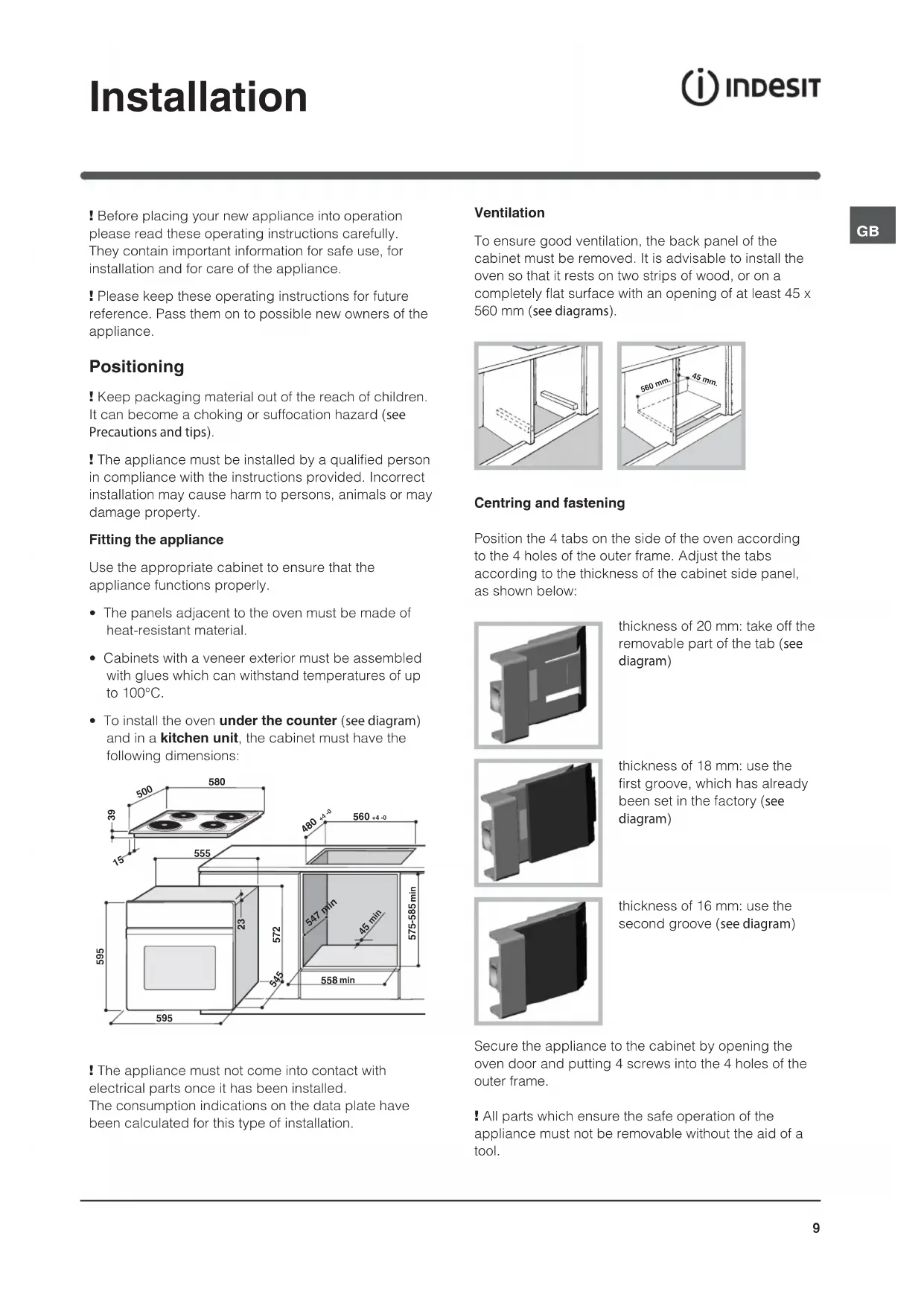 - To install the oven under the counter (see diagram) and in a kitchen unit, the cabinet must have the following dimensions: ! The appliance must not come into contact with electrical parts once it has been installed. The consumption indications on the data plate have been calculated for this type of installation. Ventilation To ensure good ventilation, the back panel of the cabinet must be removed. It is advisable to install the oven so that it rests on two strips of wood, or on a completely flat surface with an opening of at least 45 x 560 mm (see diagrams). Centring and fastening Position the 4 tabs on the side of the oven according to the 4 holes of the outer frame. Adjust the tabs according to the thickness of the cabinet side panel, as shown below: thickness of 20 mm: take off the removable part of the tab (see diagram) thickness of 18 mm: use the first groove, which has already been set in the factory (see diagram) thickness of 16 mm: use the second groove (see diagram) Secure the appliance to the cabinet by opening the oven door and putting 4 screws into the 4 holes of the outer frame. ! All parts which ensure the safe operation of the appliance must not be removable without the aid of a tool.