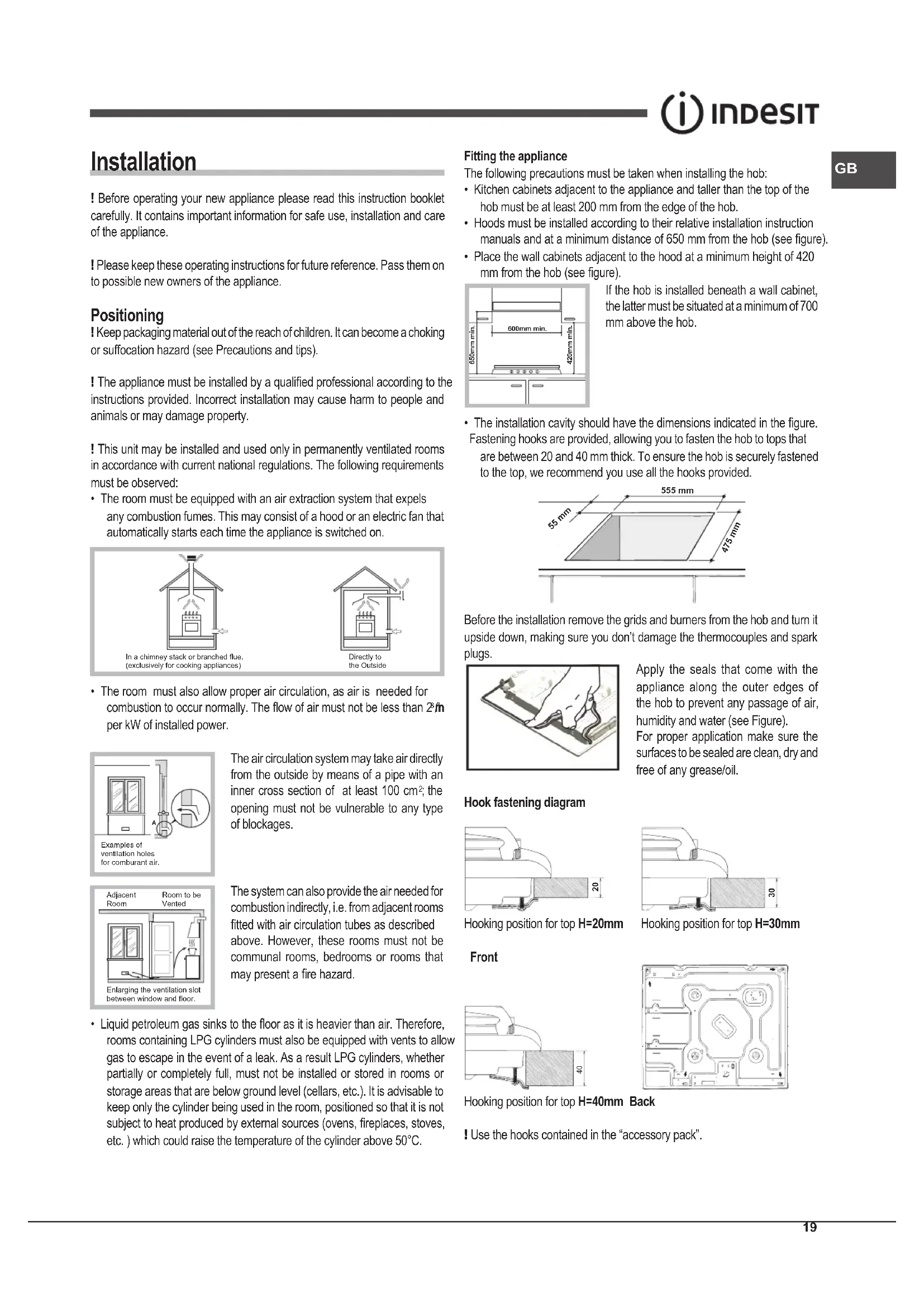 - Gas appliances require regular air exchange to maintain efcient operation. When installing the hob, follow the instructions provided in the paragraph on “Positioning” the appliance.