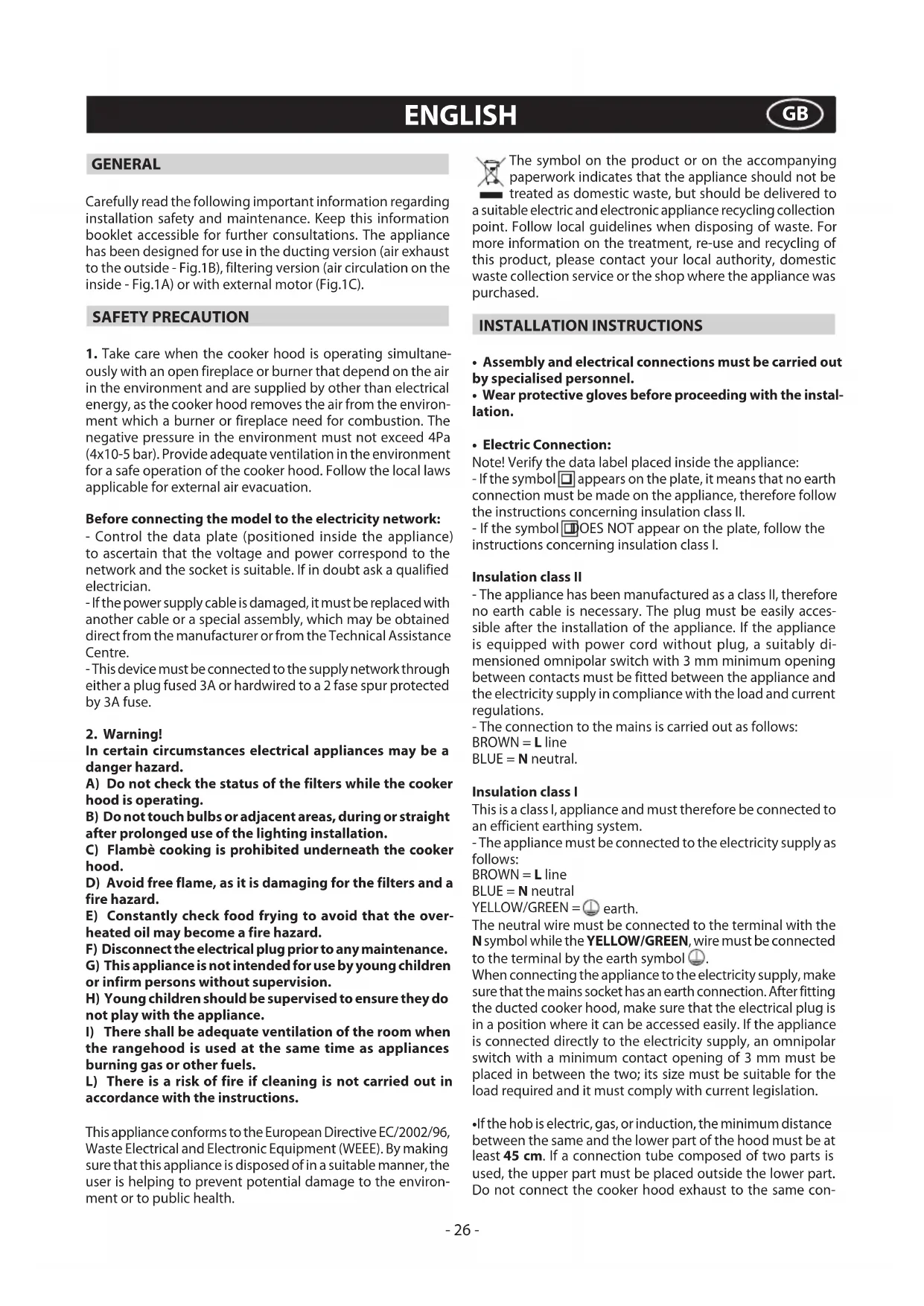 GENERAL Carefully read the following important information regarding installation safety and maintenance. Keep this information booklet accessible for further consultations. The appliance has been designed for use in the ducting version (air exhaust to the outside - Fig.1B), filtering version (air circulation on the inside - Fig.1A) or with external motor (Fig.1C). SAFETY PRECAUTION