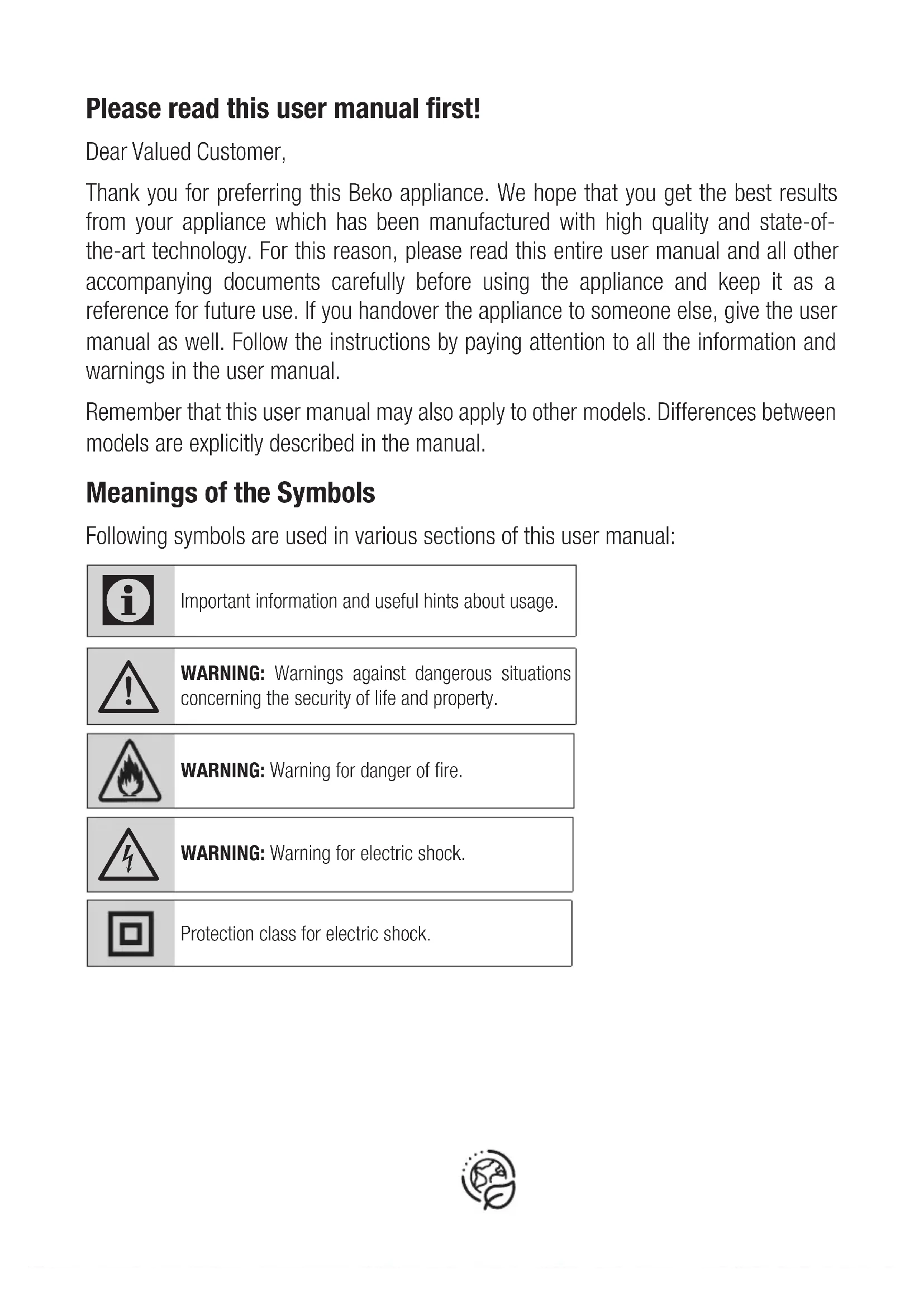 POLSKI 138-152Please read this user manual first! Dear Valued Customer, Thank you for preferring this Beko appliance. We hope that you get the best results from your appliance which has been manufactured with high quality and state-of- the-art technology. For this reason, please read this entire user manual and all other accompanying documents carefully before using the appliance and keep it as a reference for future use. If you handover the appliance to someone else, give the user manual as well. Follow the instructions by paying attention to all the information and warnings in the user manual. Remember that this user manual may also apply to other models. Differences between models are explicitly described in the manual. Meanings of the Symbols Following symbols are used in various sections of this user manual: