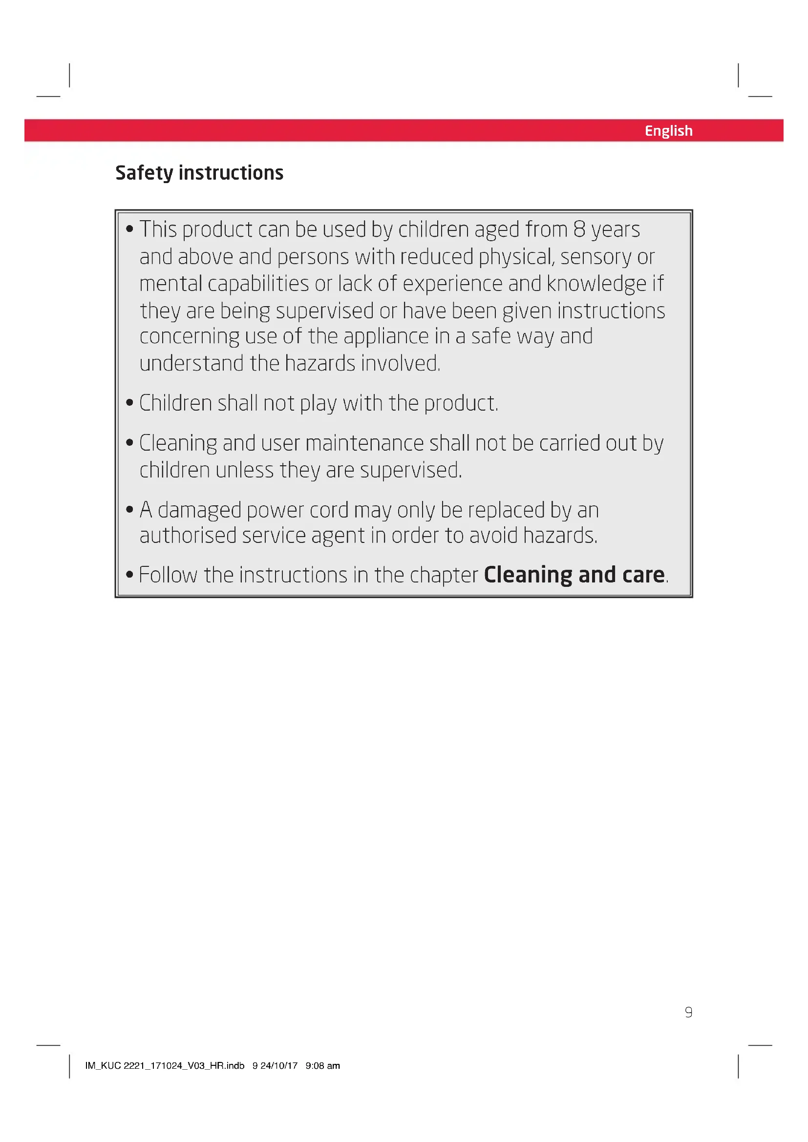 - Keep the product in a dry, cool location which is protected against moisture and direct sunlight. Keep this product out of the reach of children. IM_KUC 2221_171024_V03_HR.indb 14 24/10/17 9:08 amEspañol