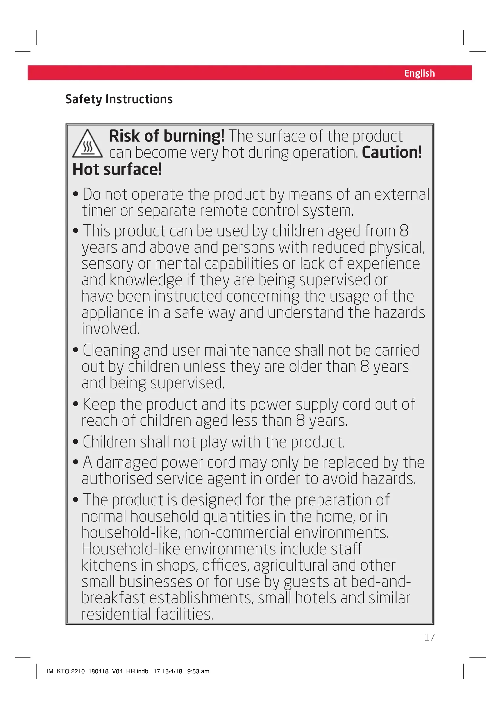 - The product is designed for the preparation of normal household quantities in the home, or in household-like, non-commercial environments. Household-like environments include sta kitchens in shops, oces, agricultural and other small businesses or for use by guests at bed-and- breakfast establishments, small hotels and similar residential facilities. IM_KTO 2210_180418_V04_HR.indb 17 18/4/18 9:53 amEnglish