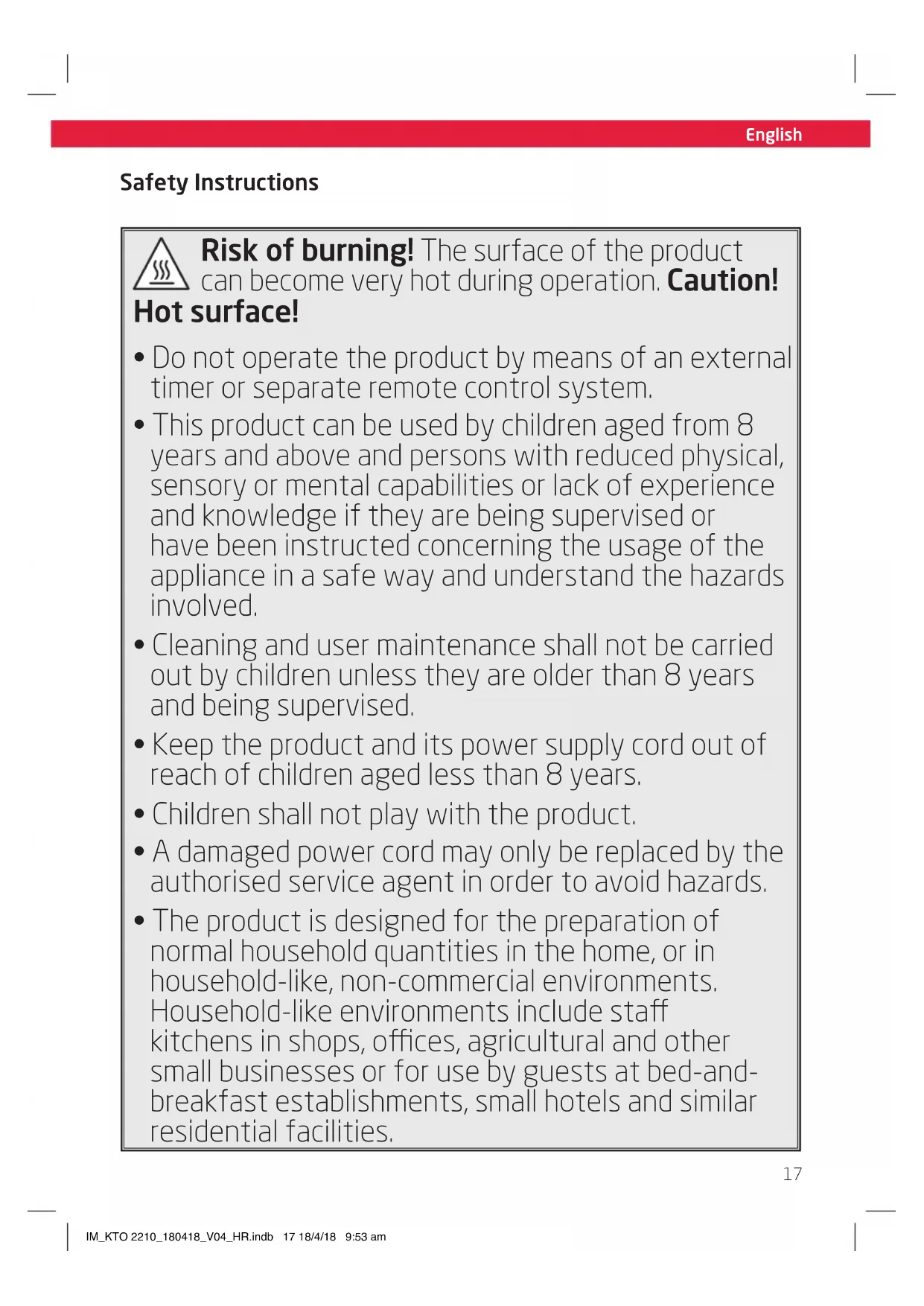 - The product is designed for the preparation of normal household quantities in the home, or in household-like, non-commercial environments. Household-like environments include sta kitchens in shops, oces, agricultural and other small businesses or for use by guests at bed-and- breakfast establishments, small hotels and similar residential facilities. IM_KTO 2210_180418_V04_HR.indb 17 18/4/18 9:53 amEnglish
