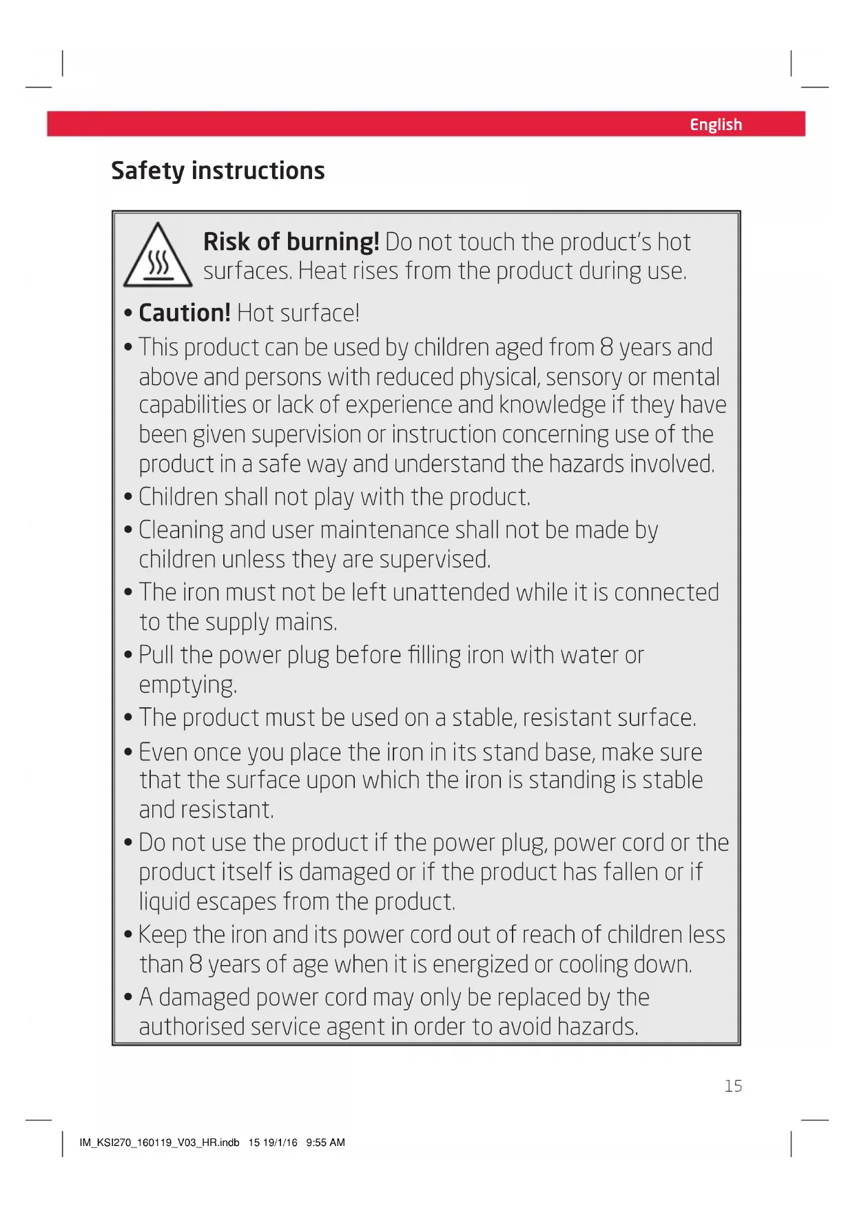 - Keep the iron and its power cord out of reach of children less than 8 years of age when it is energized or cooling down.