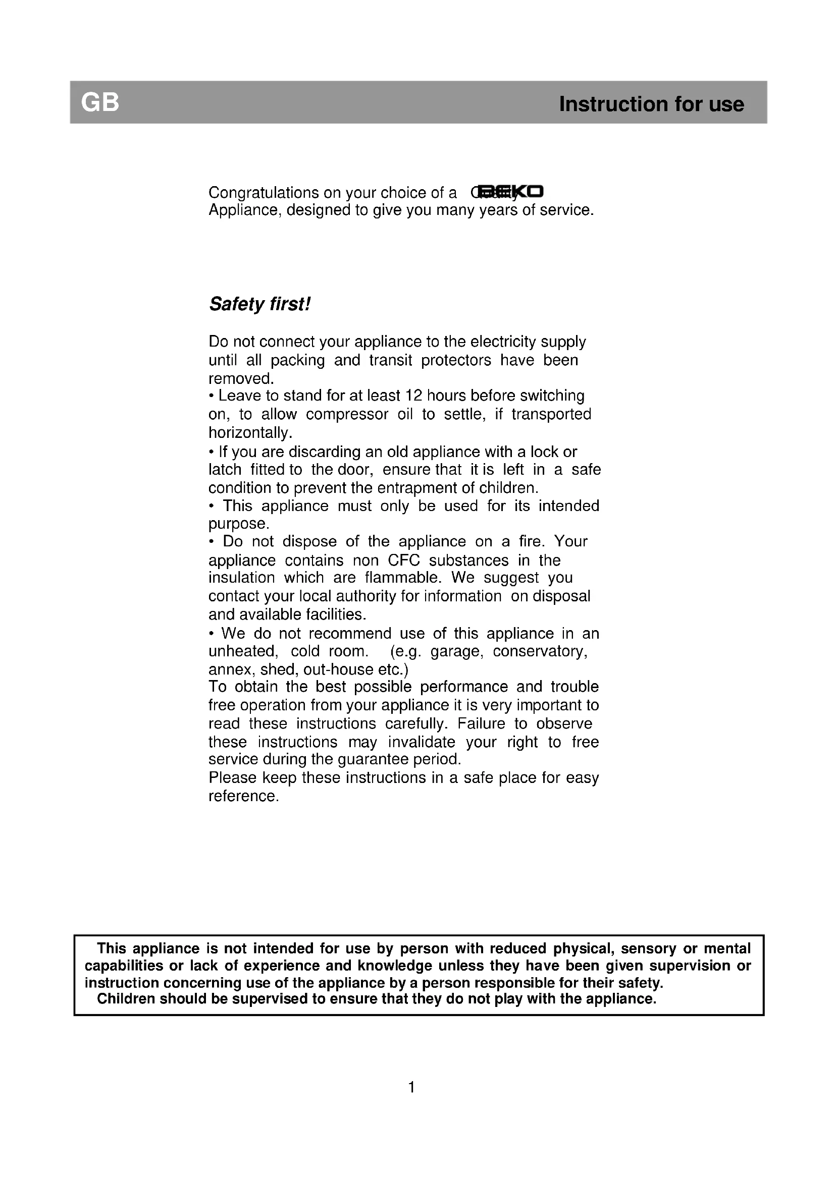 This appliance is not intended for use by person with reduced physical, sensory or mental capabilities or lack of experience and knowledge unless they have been given supervision or instruction concerning use of the appliance by a person responsible for their safety. Children should be supervised to ensure that they do not play with the appliance.GB Instruction for use Electrical requirements Before inserting the plug into the wall socket make sure that the voltage and the frequency shown in the rating plate inside the appliance corresponds to your electricity supply. We recommend that this appliance is connected to the mains supply via a suitably switched and fused socket in a readily accessible position. Warning! This appliance must be earthed. Repairs to electrical equipment should only be performed by a qualified technician. Incorrect repairs carried out by an unqualified person are carry risks that may have critical consequences for the user of the appliance. ATTENTION! This appliance operates with R600a which is an environmental friendly but flammable gas. During the transportation and fixing of the product, care must be taken not to damage the cooling system. If the cooling system is damaged and there is a gas leakage from the system, keep the product away from open flame sources and ventilate the room for a while. WARNING - Do not use mechanical devices or other means to accelerate the defrosting process, others than those recommended by the manufacturer. WARNING - Do not damage the refrigerant circuit. WARNING - Do not use electrical appliances inside the food storage compartments of the appliance, unless they are of the type recommended by the manufacturer. WARNING - If the supply cord is damaged, it must be replaced by the manufacturer, its service agent or similarly qualified persons in order to avoid a hazard. Transportation instructions