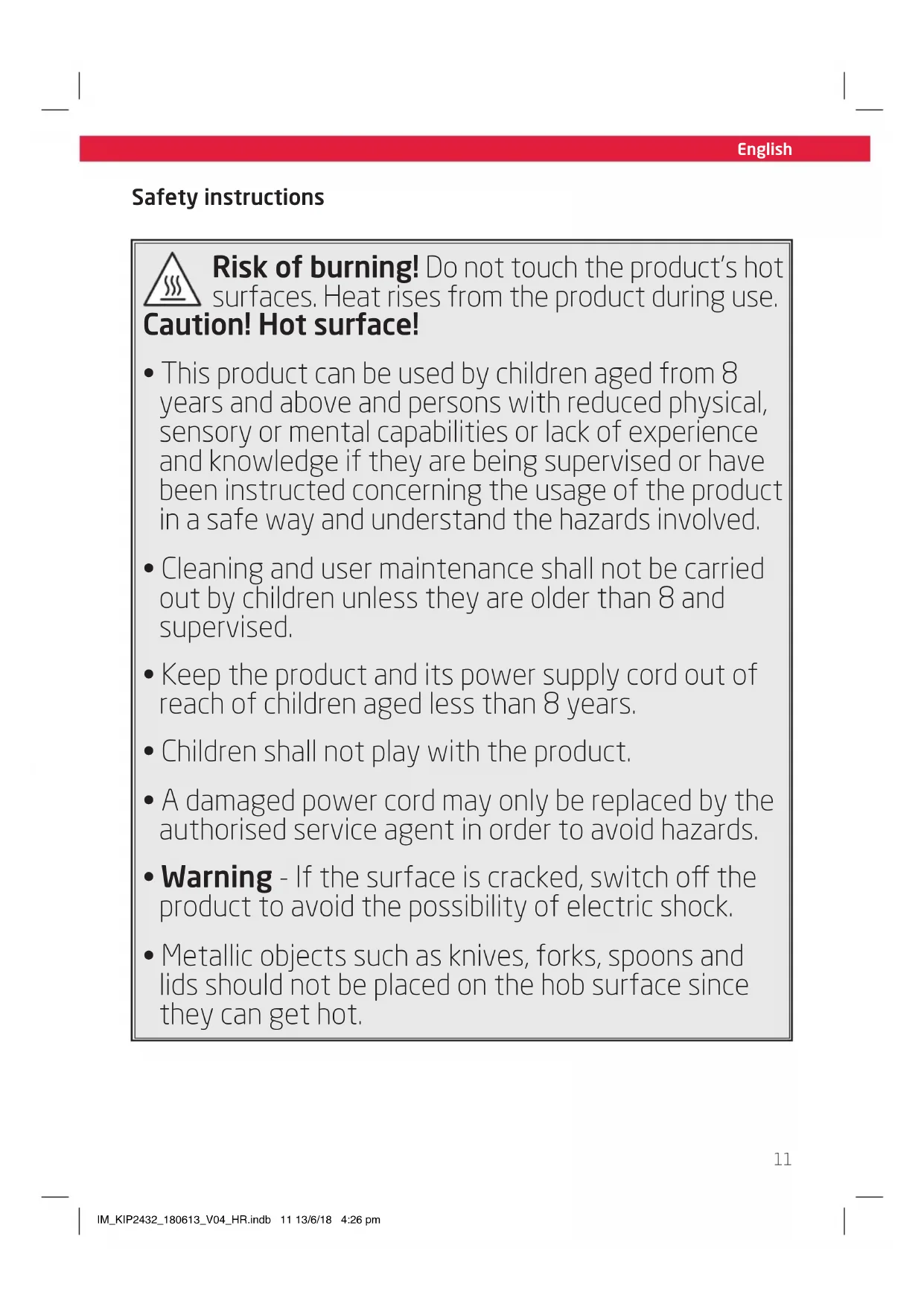 - Metallic objects such as knives, forks, spoons and lids should not be placed on the hob surface since they can get hot. IM_KIP2432_180613_V04_HR.indb 11 13/6/18 4:26 pmEnglish
