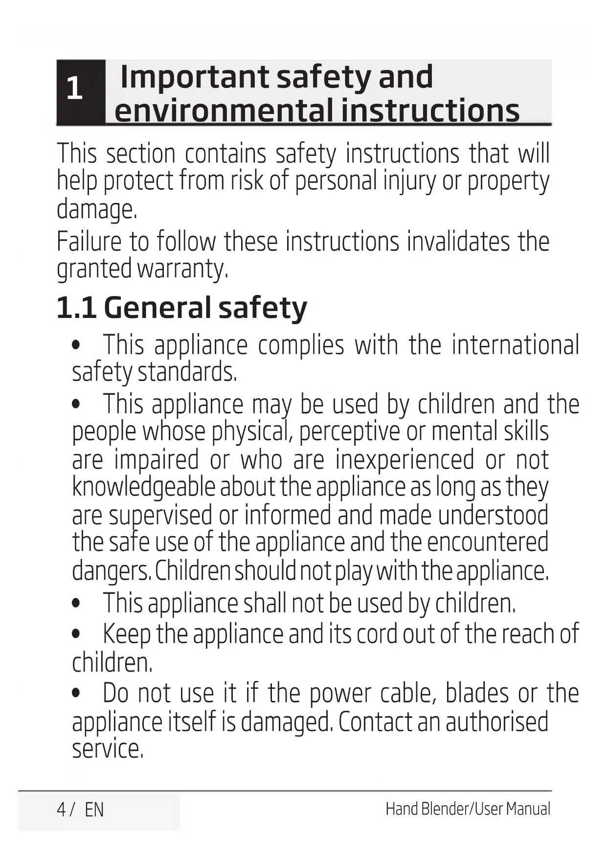 Hand Blender/User Manual This section contains safety instructions that will help protect from risk of personal injury or property damage. Failure to follow these instructions invalidates the granted warranty.