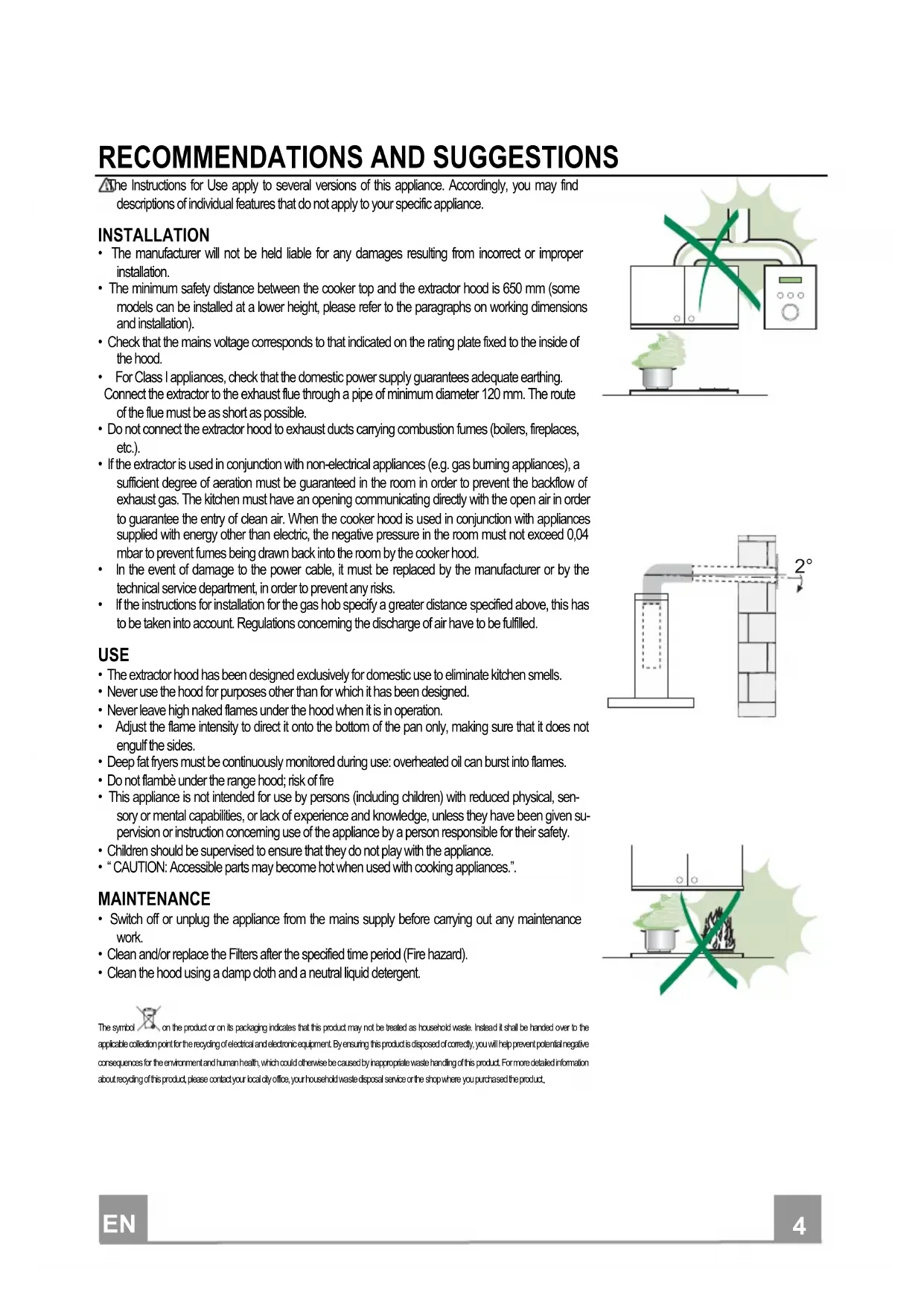 - Switch off or unplug the appliance from the mains supply before carrying out any maintenance work. • Clean and/or replace the Filters after the specified time period (Fire hazard). • Clean the hood using a damp cloth and a neutral liquid detergent. The symbol on the product or on its packaging indicates that this product may not be treated as household waste. Instead it shall be handed over to the applicable collection point for the recycling of electrical and electronic equipment. By ensuring this product is disposed of correctly, you will help prevent potential negative consequences for the environment and human health, which could otherwise be caused by inappropriate waste handling of this product. For more detailed information about recycling of this product, please contact your local city office, your household waste disposal service or the shop where you purchased the product