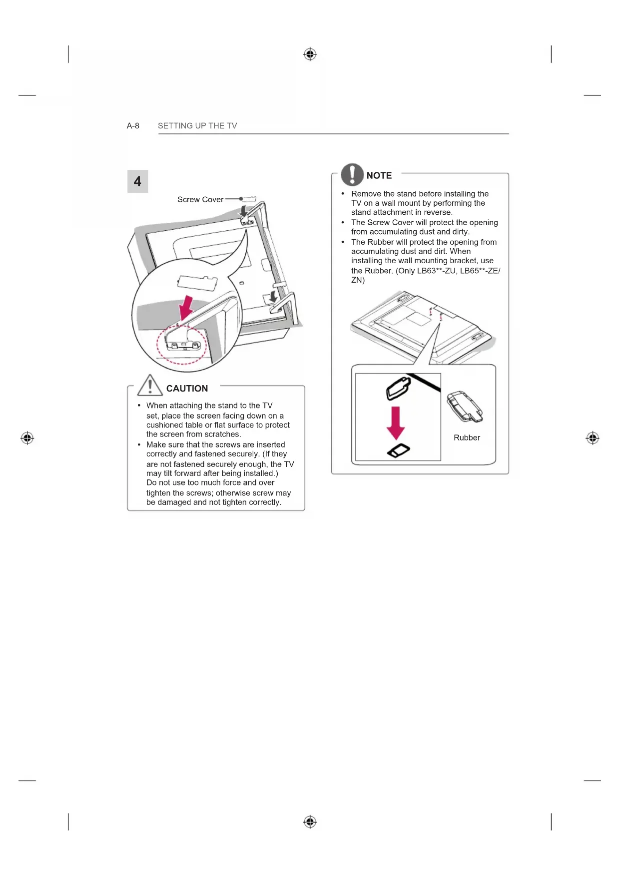 1 Attach the stand to the TV using the upper mounting hole on the back of the TV. 2 Attach the stand to the TV using the lower connection on the back of the TV.A-7