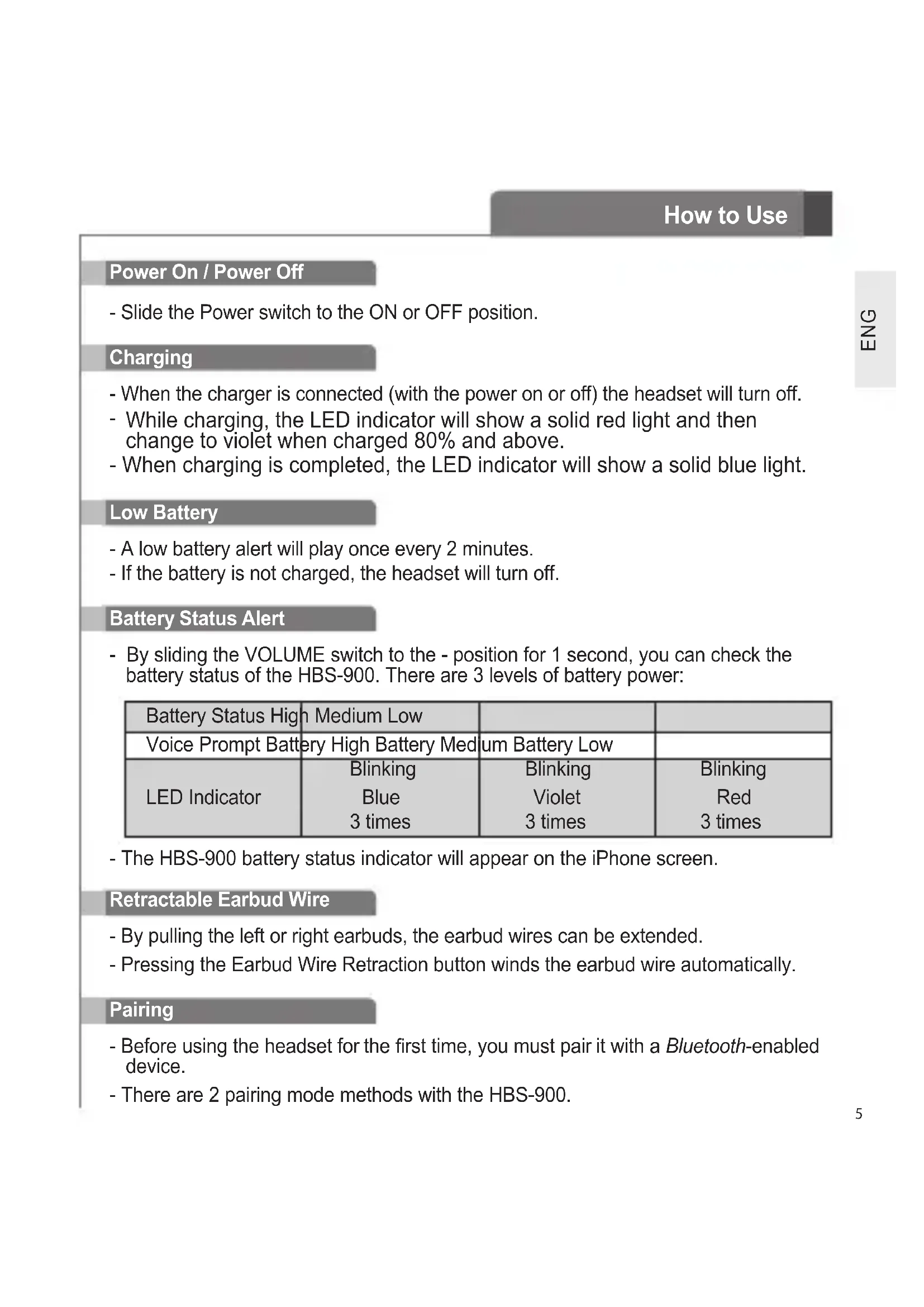 While charging, the LED indicator will show a solid red light and then change to violet when charged 80% and above. - When charging is completed, the LED indicator will show a solid blue light. Low Battery - A low battery alert will play once every 2 minutes. - If the battery is not charged, the headset will turn off. Retractable Earbud Wire - By pulling the left or right earbuds, the earbud wires can be extended. - Pressing the Earbud Wire Retraction button winds the earbud wire automatically. Power On / Power Off - Slide the Power switch to the ON or OFF position. Battery Status Alert - By sliding the VOLUME switch to the - position for 1 second, you can check the battery status of the HBS-900. There are 3 levels of battery power: Battery Status High Medium Low Voice Prompt Battery High Battery Medium Battery Low LED Indicator Blinking Blue 3 times Blinking Violet 3 times Blinking Red 3 times - The HBS-900 battery status indicator will appear on the iPhone screen. Pairing - Before using the headset for the rst time, you must pair it with a Bluetooth-enabled device. - There are 2 pairing mode methods with the HBS-900. How to Use6 ENG