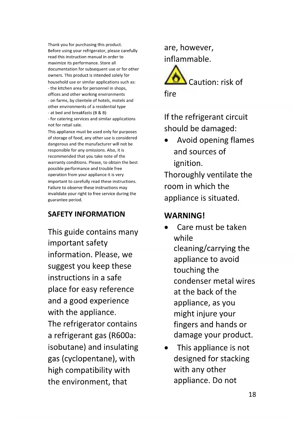 - Rimuovere la polvere accumulata sulla parte posteriore dell'elettrodomestico.18 Thank you for purchasing this product. Before using your refrigerator, please carefully read this instruction manual in order to maximize its performance. Store all documentation for subsequent use or for other owners. This product is intended solely for household use or similar applications such as: - the kitchen area for personnel in shops, offices and other working environments - on farms, by clientele of hotels, motels and other environments of a residential type - at bed and breakfasts (B & B) - for catering services and similar applications not for retail sale. This appliance must be used only for purposes of storage of food, any other use is considered dangerous and the manufacturer will not be responsible for any omissions. Also, it is recommended that you take note of the warranty conditions. Please, to obtain the best possible performance and trouble free operation from your appliance it is very important to carefully read these instructions. Failure to observe these instructions may invalidate your right to free service during the guarantee period. SAFETY INFORMATION This guide contains many important safety information. Please, we suggest you keep these instructions in a safe place for easy reference and a good experience with the appliance. The refrigerator contains a refrigerant gas (R600a: isobutane) and insulating gas (cyclopentane), with high compatibility with the environment, that are, however, inflammable. Caution: risk of fire If the refrigerant circuit should be damaged: