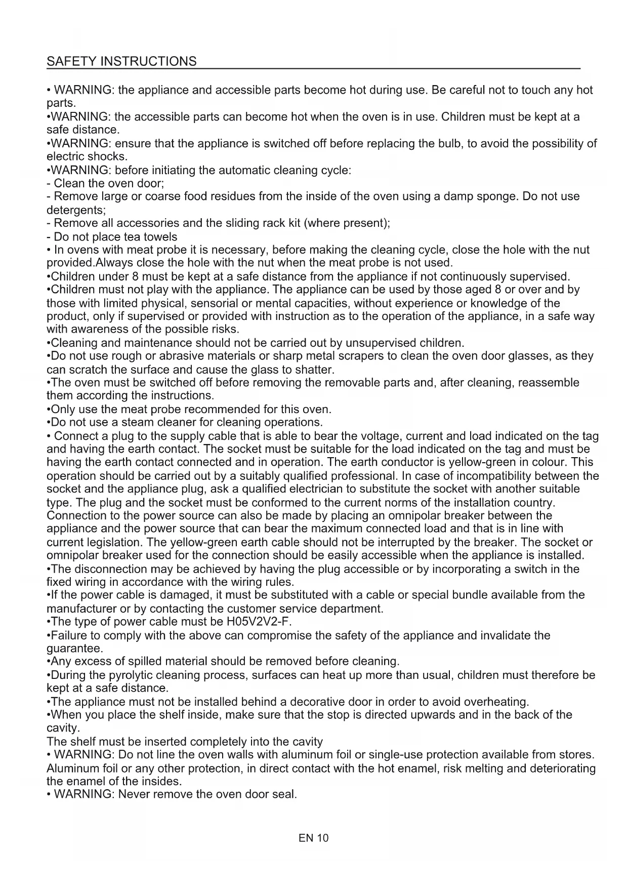 - The manufacturers cannot be held responsible for any damage caused by improper, incorrect or unreasonable use. When using any electrical appliance you must follow a few basic rules.– Do not pull on the power cable to remove the plug from the socket.– Do not touch the oven with wet or damp hands or feet.– Do not use the oven unless you are wearing something on your feet.– It is not generally a good idea to use adapters, multiple sockets forseveral plugs and cable extensions. – If the oven breaks down or develops a fault switch it off at the mains and do not touch it.•If the cable is at all damaged it must be replaced promptly.When replacing the cable, follow these instructions. Remove the power cable and replace it with one of the H05RRF, H05VV-F, H05V2V2-F type. The cable must be able to bear the electrical current required by the oven. Cable replacement must be carried out by properly qualified technicians. The earthing cable (yellow-green) must be 10 mm longer than the power cable.Use only an approved service centre for repairs and ensure that onlyoriginal parts are used. If the above instructions are not adhered to themanufacturers cannot guarantee the safety of the oven.•Do not line the oven walls with aluminium foil or single-useprotection available from stores. Aluminium foil or any otherprotection, in direct contact with the hot enamel, risks melting anddeteriorating the enamel of the insides.