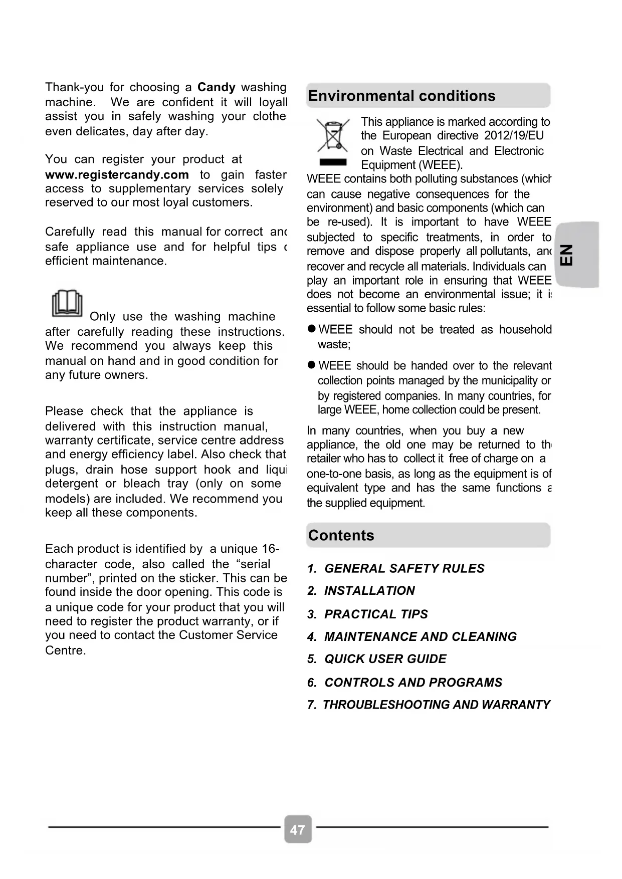 Thank-you for choosing a Candy washing machine. We are confident it will loyally assist you in safely washing your clothes, even delicates, day after day. You can register your product at www.registercandy.com to gain faster access to supplementary services solely reserved to our most loyal customers. Carefully read this manual for correct and safe appliance use and for helpful tips on efficient maintenance. Only use the washing machine after carefully reading these instructions. We recommend you always keep this manual on hand and in good condition for any future owners. Please check that the appliance is delivered with this instruction manual, warranty certificate, service centre address and energy efficiency label. Also check that plugs, drain hose support hook and liquid detergent or bleach tray (only on some models) are included. We recommend you keep all these components. Each product is identified by a unique 16- character code, also called the “serial number”, printed on the sticker. This can be found inside the door opening. This code is a unique code for your product that you will need to register the product warranty, or if you need to contact the Customer Service Centre.