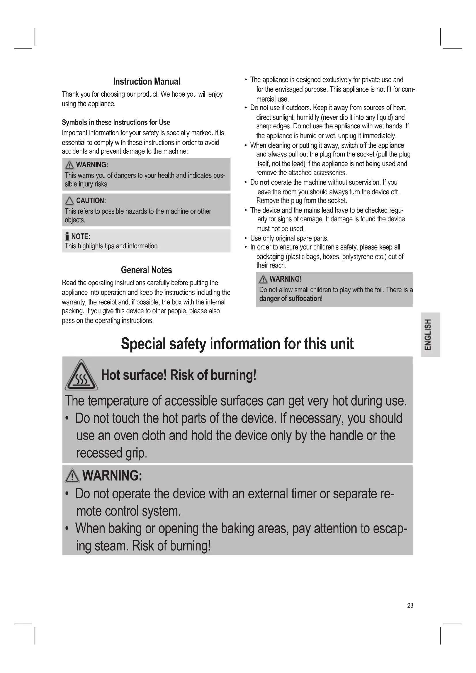 - In order to ensure your children’s safety, please keep all packaging (plastic bags, boxes, polystyrene etc.) out of their reach. WARNING! Do not allow small children to play with the foil. There is a danger of suffocation! Special safety information for this unit Hot surface! Risk of burning! The temperature of accessible surfaces can get very hot during use.