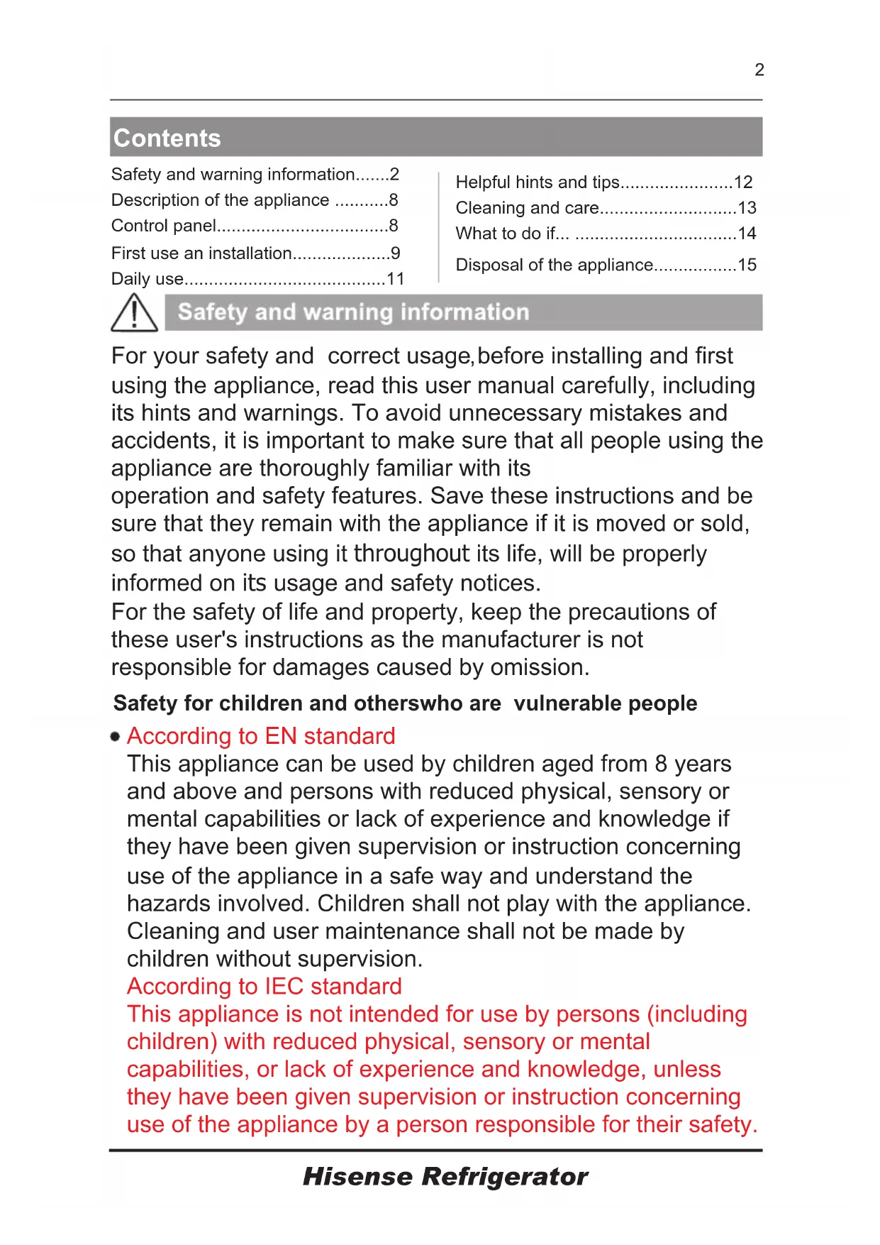 - responsible for damages caused by omission. Hisense Refrigerator Safety for children and otherswho are vulnerable people According to EN standard According to IEC standard This appliance is not intended for use by persons (including children) with reduced physical, sensory or mental capabilities, or lack of experience and knowledge, unless they have been given supervision or instruction concerning use of the appliance by a person responsible for their safety. This appliance can be used by children aged from 8 years and above and persons with reduced physical, sensory or mental capabilities or lack of experience and knowledge if they have been given supervision or instruction concerning use of the appliance in a safe way and understand the hazards involved. Children shall not play with the appliance. Cleaning and user maintenance shall not be made by children without supervision. Safety and warning information p. 2