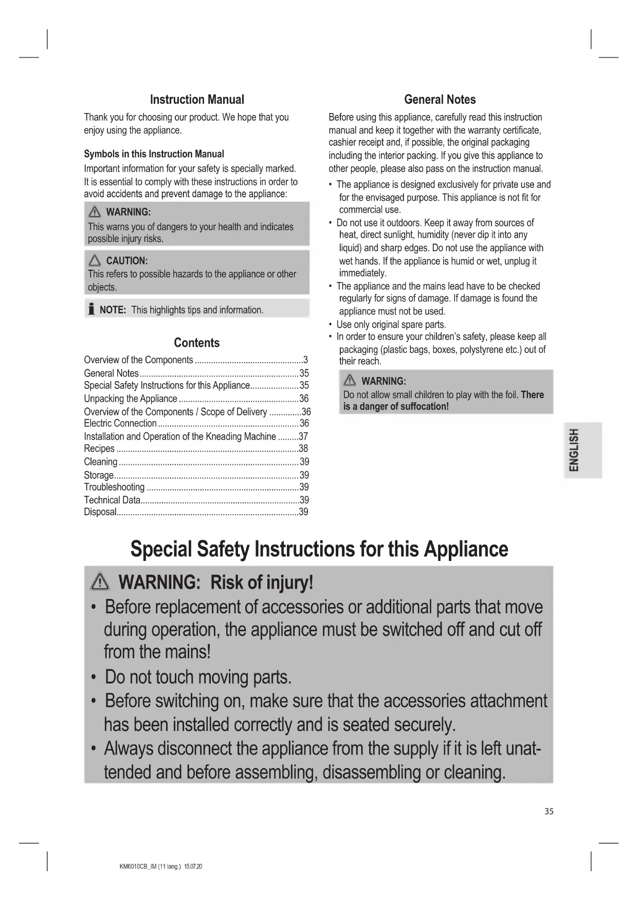 damages should be noticeable, do not operate the appli- ance. Return it to the distributor immediately. NOTE: Dust or production residues may still be found on the appliance. We recommend that you clean the appliance as described under “Cleaning”. Overview of the Components / Scope of Delivery 1 Swivel arm 2 Motor housing 3 Lever for lowering / raising the arm 4 Control knob 5 Mixing bowl 6 Splash guard 7 Whisk 8 Mixing hook 9 Kneading hook 10 Protective disk Electric Connection Check that the mains voltage to be used matches the volt- age of the appliance. Refer to the rating label for detailed specications.KM6010CB_IM (11 lang.) 15.07.20