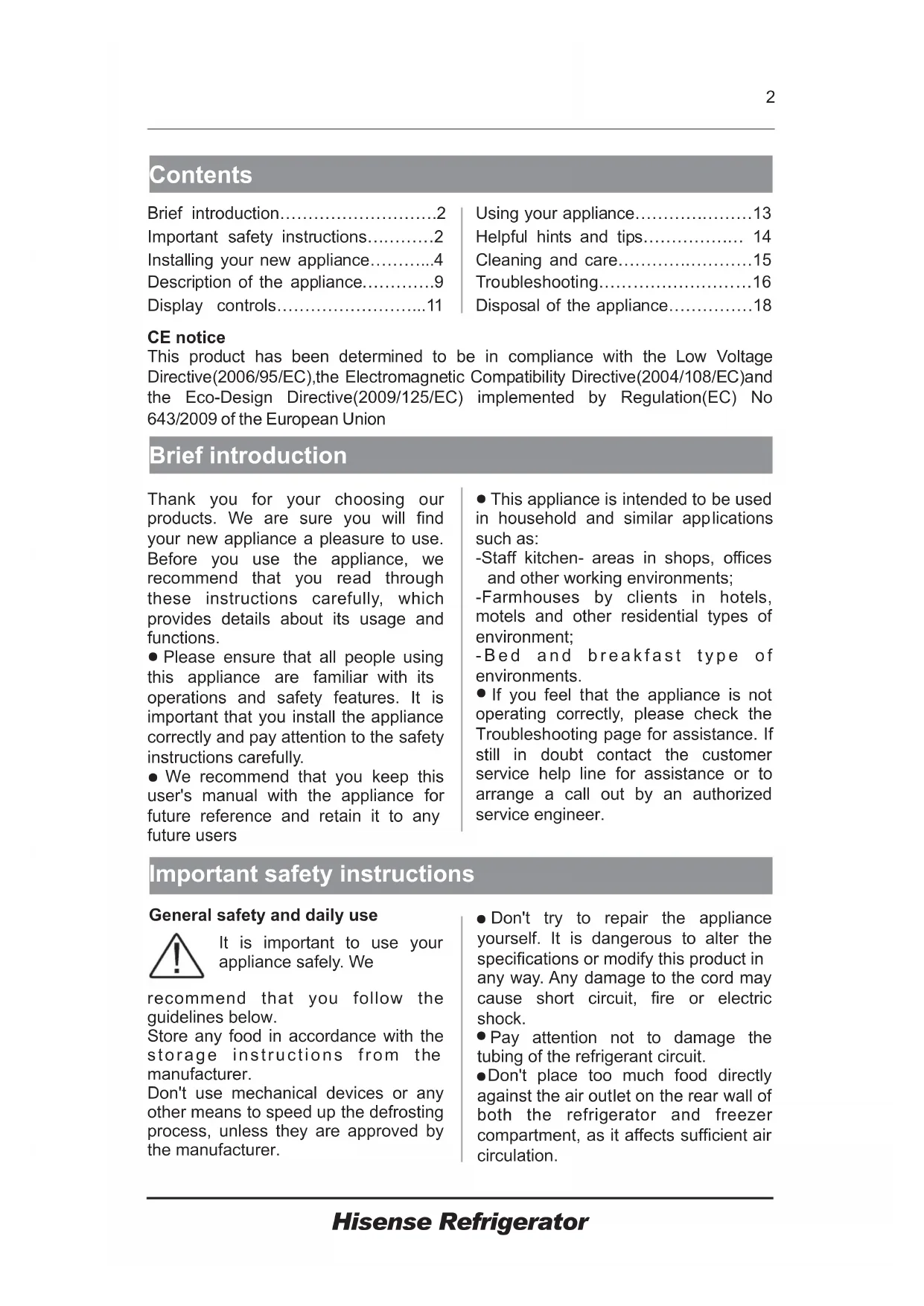 recommend that you follow the guidelines below. Store any food in accordance with the storage instructions from the manufacturer. Don't use mechanical devices or any other means to speed up the defrosting process, unless they are approved by the manufacturer. It is important to use your appliance safely. We CE notice This product has been determined to be in complia nce with the Low Voltage Directive(2006/95/EC),the Electromagnetic Compatibility Directive(2004/108/EC)and the Eco-Design Directive(2009/125/EC) implemented by Regulation(EC) No 643/2009 of the European Union This appliance is intended to be used in household and similar app lications such as: -Staff kitchen- areas in shops, offices and other working environments; -Farmhouses by clients in hotels, motels and other residential types of environment; - Bed a nd brea kfa st type of environments. If you feel that the appliance is not operating correctly, please check the Troublesh ooting page for assistance. If still in doubt contact the customer service help line for assistance or to arrange a call out by an authorized service engineer.