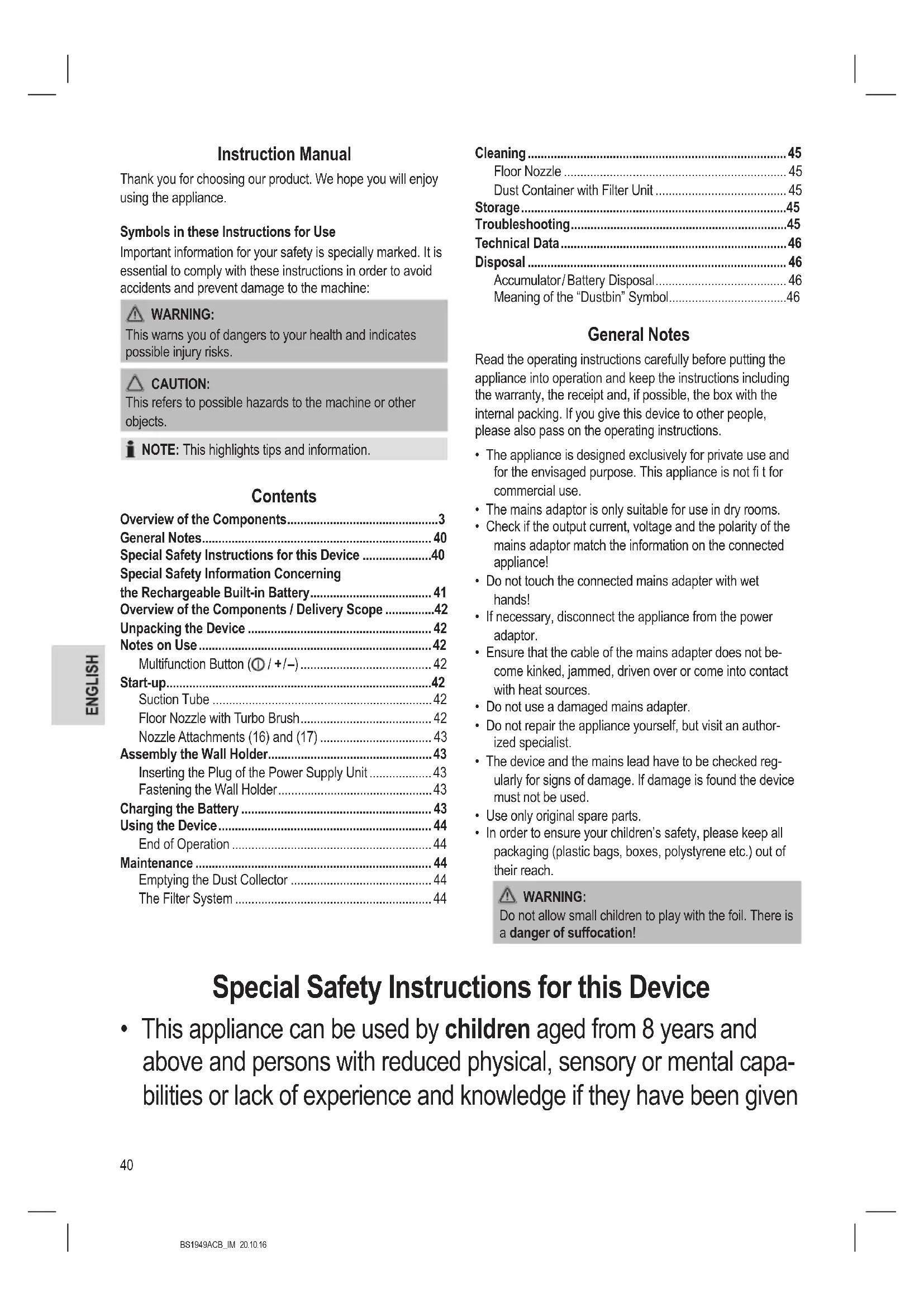 Problem Possible cause Remedy Dust escapes from the dust container. The dust container is not closed correctly. Check the installa- tion of the lter unit, the cover, and the base plate. The recharge- able battery does not keep the charge. The rechargeable battery has reached the end of its life. Contact our service or your dealer. Technical Data Model:.................................................................BS 1949 A CB Net weight (Hand unit with crevice nozzle): .......approx. 1.5 kg Mains Adapter Protection class: ...................................................................... Input: .......................................AC 100 - 240 V, 50 / 60 Hz, 0.5 A Output:.........................................................DC 26.5 V, 500 mA Polarity: ........................................................................ Battery: ........................................... 6 x 3.6 V, 2200 mAh Li-Ion Operating time:....................................... 30 minutes maximum Charging time: .................................................. approx. 5 hours The right to make technical and design modications in the course of continuous product development remains reserved. This device has been tested according to all relevant current CE guidelines, such as electromagnetic compatibility and low voltage directives, and has been constructed in accordance with the latest regulations. Disposal Accumulator / Battery Disposal The unit contains a rechargeable battery. Used batteries / accumulators (rechargeable batter- ies) do not belong in household waste. The battery must be removed before the prod- uct is recycled. Contact qualied personnel. Information, where batteries / accumulators are to be disposed of can be obtained from your local or municipal authorities. Meaning of the “Dustbin” Symbol Protect our environment: do not dispose of electrical equipment in the domestic waste. Please return any electrical equipment that you will no longer use to the collection points provided for their disposal. This helps avoid the potential effects of incorrect disposal on the environment and human health. This will contribute to the recycling and other forms of reutili- sation of electrical and electronic equipment. Information concerning where the equipment can be disposed of can be obtained from your local authority.47