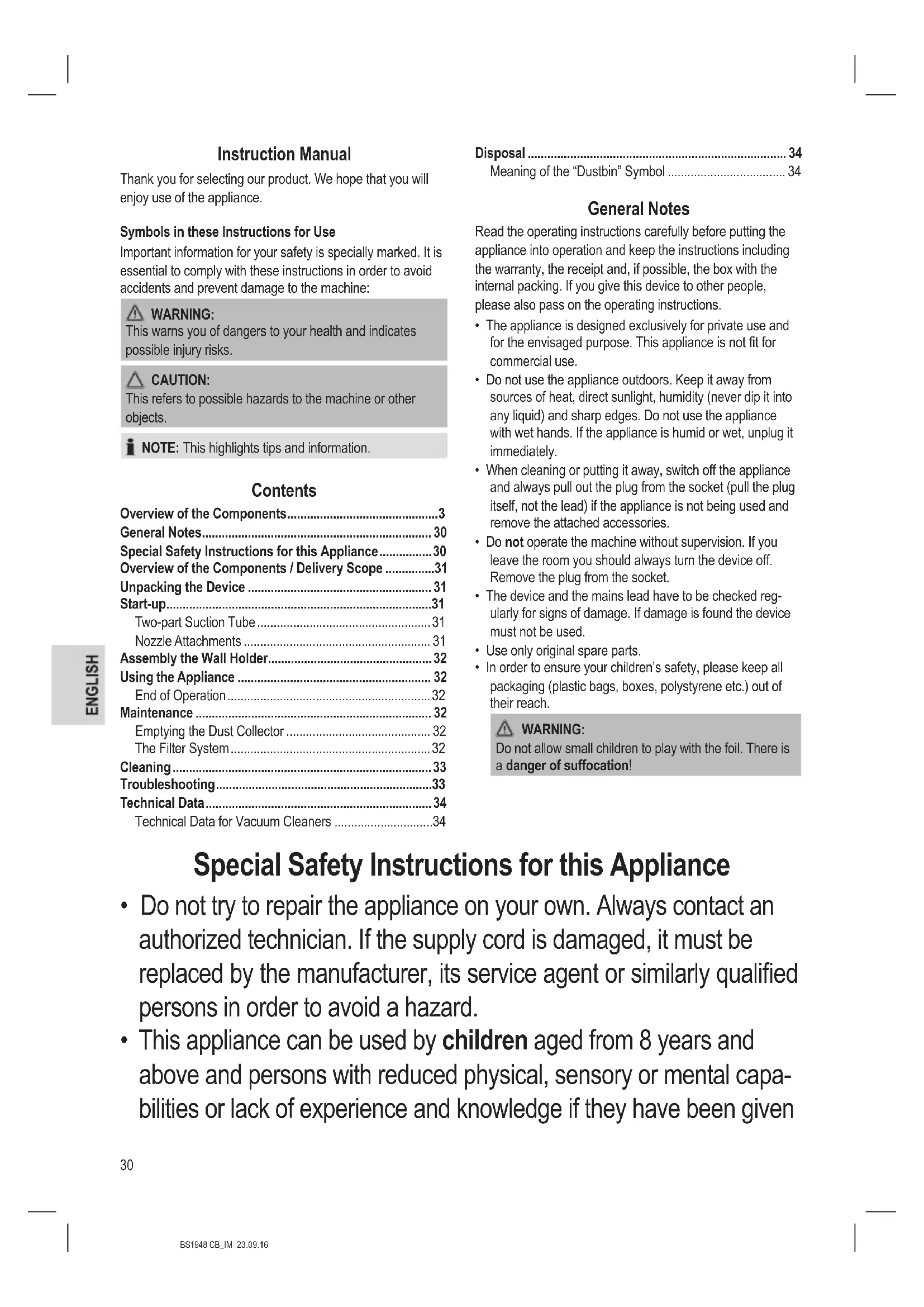 - This appliance can be used by children aged from 8 years and above and persons with reduced physical, sensory or mental capa- bilities or lack of experience and knowledge if they have been given31 BS1948 CB_IM 23.09.16 supervision or instruction concerning use of the appliance in a safe way and understand the hazards involved.