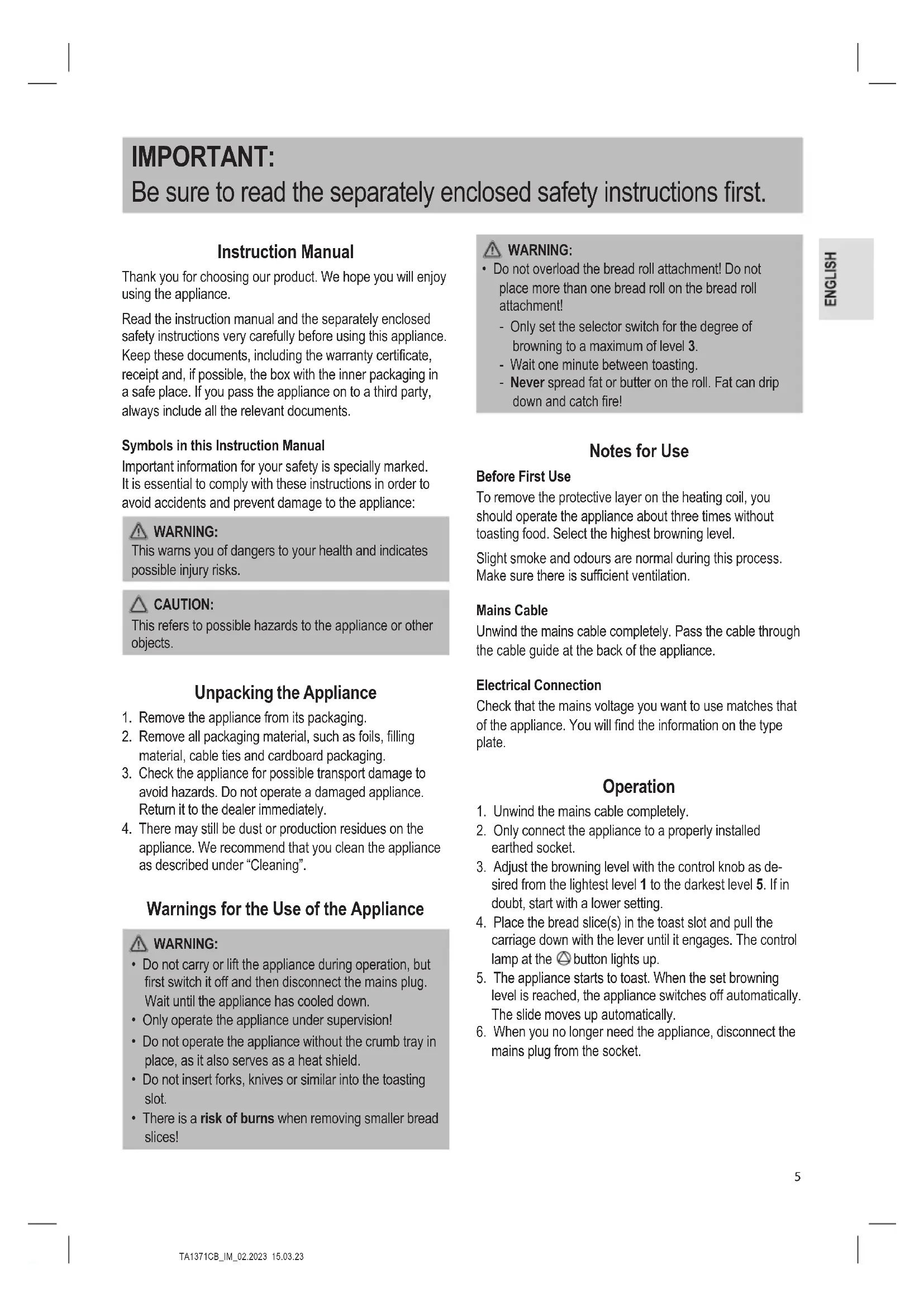 Pull the mains plug out of the socket! Let the appliance cool down! Free the bread slice with an insulated object, e. g. a wooden stick. If necessary, turn the toaster over so that the bread slice falls out. Technical Data Model:.................................................................. TA 1371 CB Power supply:.....................................220 – 240 V~, 50 / 60 Hz Power consumption: ............................................ 750 – 850 W Protection class: ..................................................................... Net weight: ....................................................... approx. 1.2 kg The right to make technical and design modications in the course of continuous product development remains reserved. This appliance has been tested according to all applicable, current CE directives and built according to the latest safety regulations. Disposal Meaning of the “Dustbin” Symbol Protect our environment: do not dispose of elec- trical equipment in the domestic waste. Please return any electrical equipment that you will no longer use to the collection points provided for their disposal. This helps avoid the potential effects of incorrect disposal on the environment and human health. This will contribute to the recycling and other forms of re-utilisation of electrical and electronic equipment. Information concerning where the equipment can be disposed of can be obtained from your local authority. Your dealer and contractual partner is also obliged to take back the old appliance free of charge.TA1371CB_IM_02.2023 15.03.23