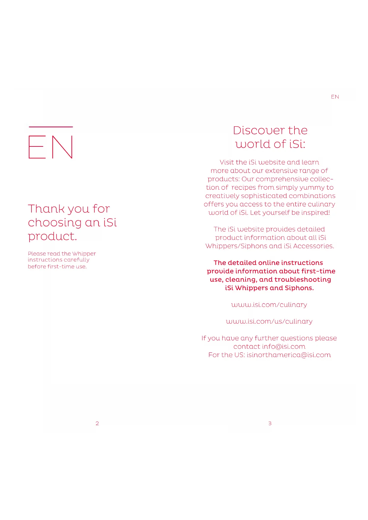 Thank you for choosing an iSi product. Please read the Whipper instructions carefully before first-time use. Discover the world of iSi: Visit the iSi website and learn more about our extensive range of products: Our comprehensive collec- tion of recipes from simply yummy to creatively sophisticated combinations offers you access to the entire culinary world of iSi. Let yourself be inspired! The iSi website provides detailed product information about all iSi Whippers/Siphons and iSi Accessories. The detailed online instructions provide information about first-time use, cleaning, and troubleshooting iSi Whippers and Siphons. www.isi.com/culinary www.isi.com/us/culinary If you have any further questions please contact info@isi.com For the US: isinorthamerica@isi.com4 5 recommends that only iSi parts and products be used with iSi products, including that only iSi chargers be used with iSi Whippers/Siphons and that iSi chargers be used only in iSi Whippers/Si- phons. Failure to follow this recommendation or any failure to follow the instructions for use and care of the products invalidates this warranty and all implied warranties in their entirety as to any consequences of such failure.