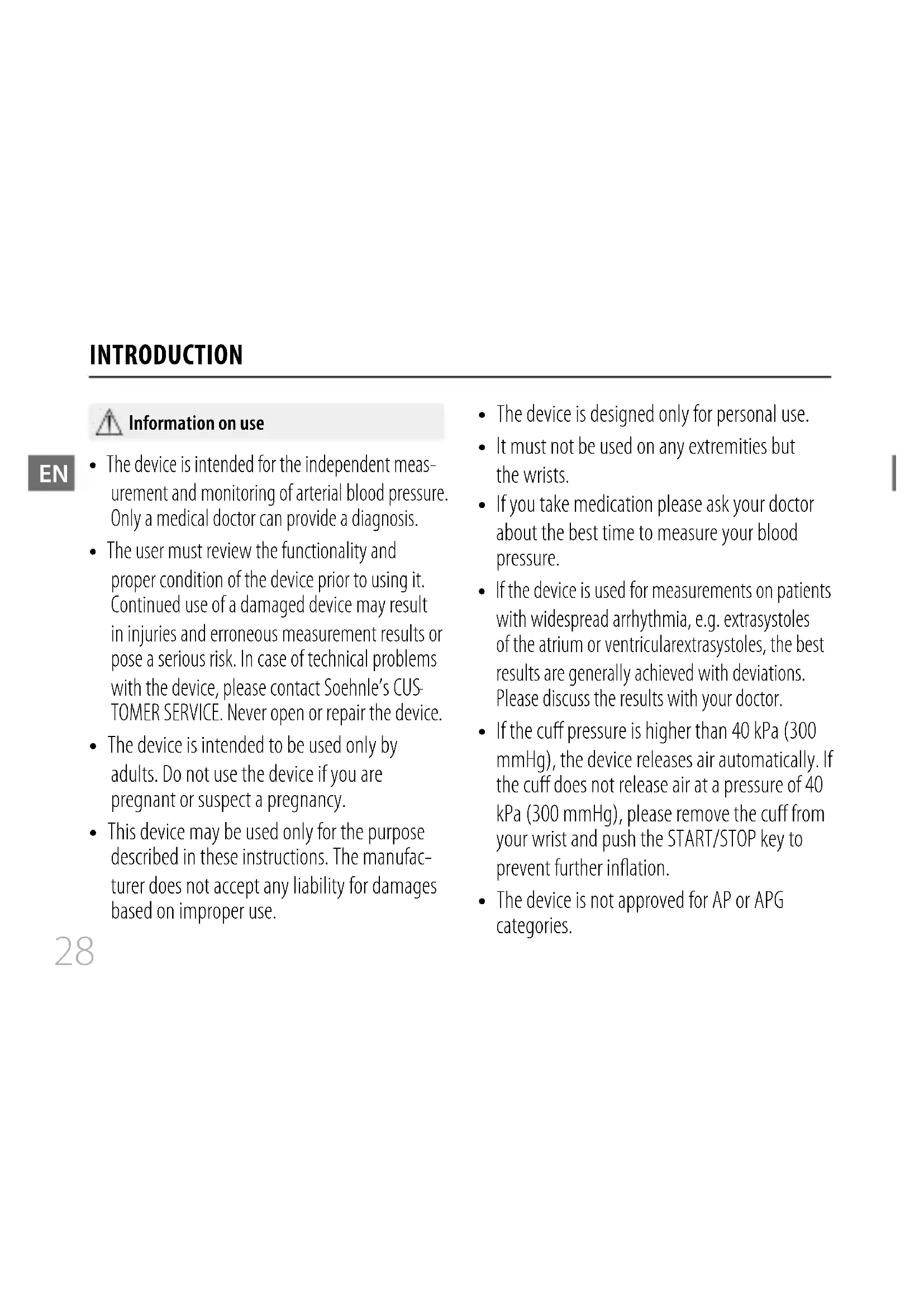 INTRODUCTION Scope of delivery 1x wrist blood pressure monitor Systo Monitor 100 2x alkaline battery AAA 3V DC 1x user instruction General description Thank you for choosing the wrist blood pressure monitor Soehnle Systo Monitor 100. Measurements taken with Soehnle Systo Monitor 100 are equal to those taken by a trained professional. This user instruction contain important information concerning safety, care of the device, and explain the proper use step-by-step. Indications for Use The Soehnle Systo Monitor 100 is digital monitors intended for use in measuring blood pressure and heartbeat rate with wrist circumference ranging from 13.5 – 21.5 cm / 5.31 – 8.46 inch