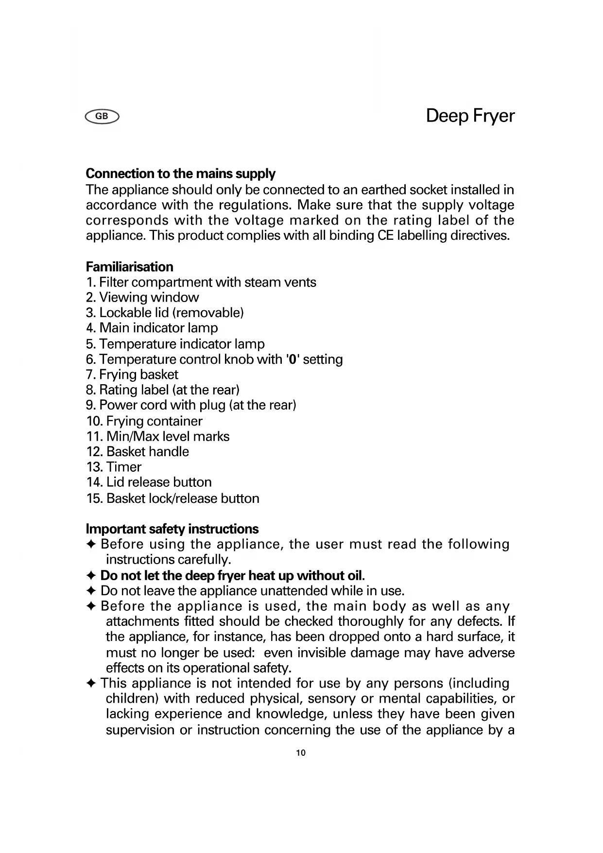 Deep Fryer GBperson responsible for their safety. ✦ Children must be supervised to ensure that they do not play with the appliance. ✦ Always place the unit on a level, heat-resistant work surface impervious to splashes and stains and with sufficient space around it. Do not place it underneath any wall-cupboards or hanging objects, nor directly by a wall or in a corner. ✦ Oil that has been used many times before may ignite when overheated. If this occurs, remove the plug from the wall socket and place the lid on the appliance in order to smother the flames. Never pour water into hot or burning oil or fat. ✦ Never carry the appliance when it is hot, e.g. during or immediately after use (because of the danger of tripping). Exercise extreme caution: hot oil can cause severe burns. ✦ Caution: some parts of the appliance become hot during operation, and dangerously hot steam may be emitted from the lid. ✦ Do not touch hot oil with your fingers. ✦ Do not put plastic cutlery into the hot oil. Do not pour hot oil into plastic containers. ✦ Do not immerse the appliance in water or any other liquid. ✦ Do not let the power cord hang free, and keep the cord well away from hot parts of the appliance. ✦ Always remove the plug from the wall socket after use, and also - in case of any malfunction - during cleaning of the appliance. ✦ When removing the plug from the wall socket, never pull on the power cord; always grip the plug itself. Do not let the cord hang free. ✦ The appliance is not intended to be operated by means of an external timer or separate remote-control system. ✦ No responsibility will be accepted if damage results from improper use, or if these instructions are not complied with. ✦ This appliance is intended for domestic use only and not for commercial applications. ✦ In order to comply with safety regulations and to avoid hazards, repairs of electrical appliances must be carried out by qualified personnel, including the replacement of the power cord. If repairs are needed, please send the appliance to one of our customer service departments. The address can be found in the appendix to this manual. 11Operating features Lid The lid is opened by pressing the lid release button. The lid is spring- loaded and lifts up automatically once the button is pressed. To close the lid, press it down until it locks into place. When the open lid is in a vertical position, it may be removed for cleaning by pulling it gently upwards. Inspection window The inspection window is helpful when monitoring the frying process. To prevent condensation from water vapour, a little oil should be applied to the inside of the window. Frying container ✦ Fill level: During the pre-heating phase, the oil level must be between the minimum and maximum level marks, which can be found inside the frying container at the rear. The maximum fill capacity of the container is approx. 2.5 litres. ✦ Types of oil or fat to be used: Only pure vegetable oil or solidified fat should be used in this deep fryer. It can be safely heated up to 220° C and has a neutral taste. Do not mix different kinds of oil or fat. ✦ Solidified fat: Never melt solidified fat in an empty fryer However, solidified fat may be added straight into the frying container, if it already contains liquid fat up to the minimum level mark. Frying basket The basket is designed to hold the food to be fried. Ensure that the basket is not over-filled. The deep fryer can accommodate a maximum of 500g of chips (French fries). Please refer to Useful hints for deep- frying. With the lid closed, the basket can be lowered into the hot oil from the outside by its handle. To lower the basket, use the lock/release button integrated in the handle and move the handle down. To raise the basket clear of the oil, move the handle upwards until it locks in a horizontal position. 12Timer By turning the timer clockwise, the intended operating time can be set. With the timer set to position 'I', the appliance is permanently switched on. To switch off, turn the timer back to its '0'-position. When setting the cooking time to less than 10 minutes, turn the timer to a greater value first and then turn it slowly back to the desired setting. After the pre-programmed time has elapsed, a sound signal is heard and the appliance is automatically switched off. Indicator lamps The main indicator lamp shows that the appliance is in operation and remains lit as long as the appliance is connected to the mains and the timer is active. Once the pre-set temperature level has been reached, the temperature indicator lamp lights up. As soon as the temperature falls below a certain level, heating will resume as indicated by the lamp. Temperature control By means of the temperature control knob, the temperature can be set to the desired level. Before using for the first time ✦ Remove any packaging materials completely. ✦ Before the appliance is used for the first time, the frying container and basket should be thoroughly cleaned. The inside of the lid should be wiped with a damp cloth. To prevent water from mixing with the oil, all parts must be thoroughly dried. ✦ Fill the container with approx 2.5 litres of vegetable oil. Operation